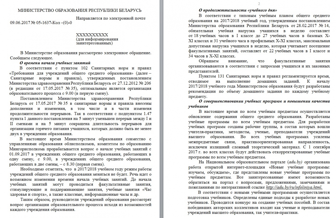 Во многих школах на родительских собраниях озвучена информация о смещении начала уроков с 1 сентября 2017 года на 8-30 (для школ с 2-х сменным режимом обучения ) и на 9-00 в школах, где занятия проводятся в одну смену. Причину и необходимость такого переноса не озвучили, никаких нормативных правовых актов в обоснование данного решения не приведено, обсуждение и согласование указанных изменений с родителями не проводилось.