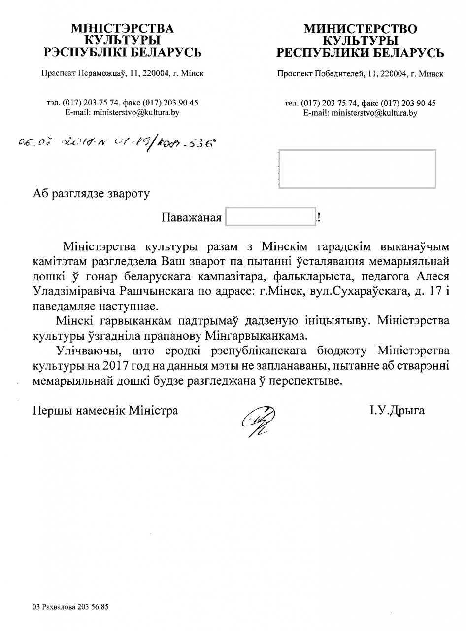 Просім разгледзець магчымасць усталявання твора манументальнага мастацтва - мемарыяльнай дошкі ў гонар беларускага кампазітара, фалькларыста, педагога Алеся Уладзіміравіча Рашчынскага па адрасе г. Мінск, вуліца Сухараўская, дом 17, у якім жыў і працаваў творца.