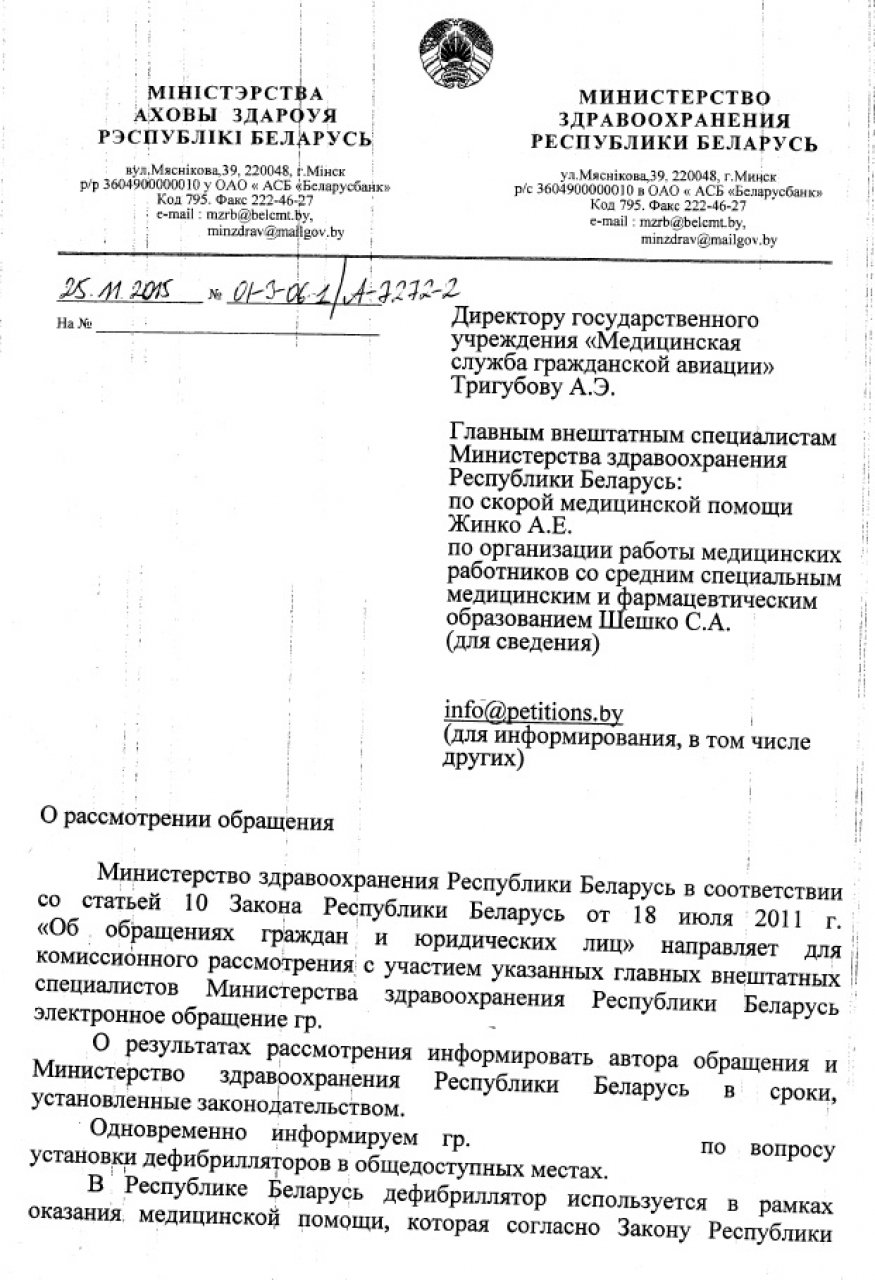 Дефибриллятор может использоваться только медицинскими работниками. Обращение дополнительно направлено на рассмотрение в Медицинскую службу гражданской авиации.