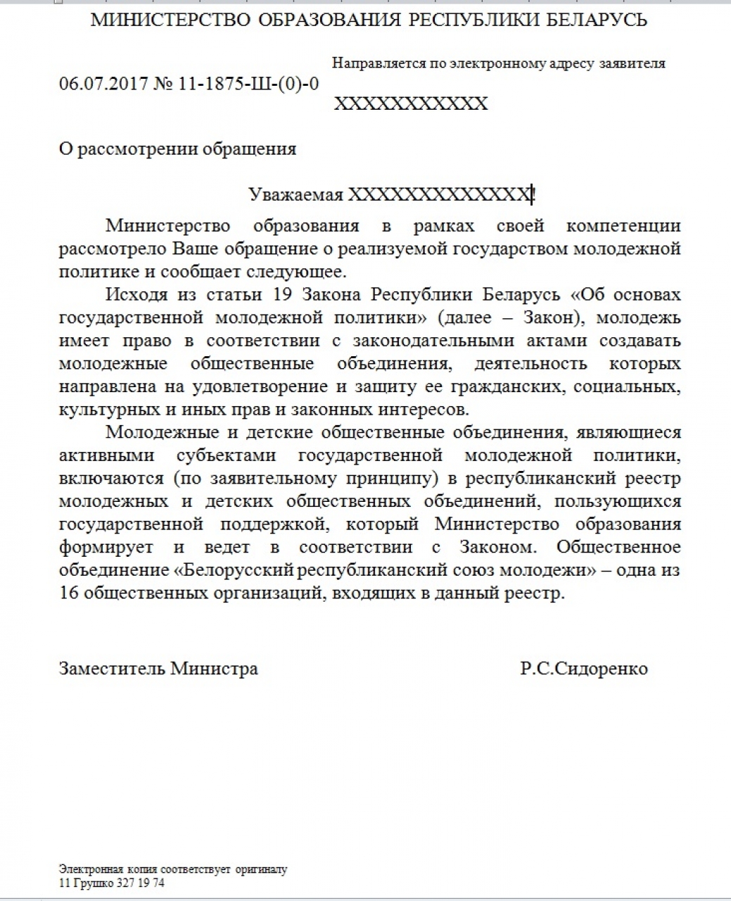 - Обеспечить неукоснительное соблюдение ст. 19 Закона Республики Беларусь "Об основах государственной молодежной политики" относительно запрета права одной организации на монопольное выражение интересов и потребностей всей молодежи, а также прямого или косвенного принуждения молодежи к вступлению в молодежные общественные объединения.