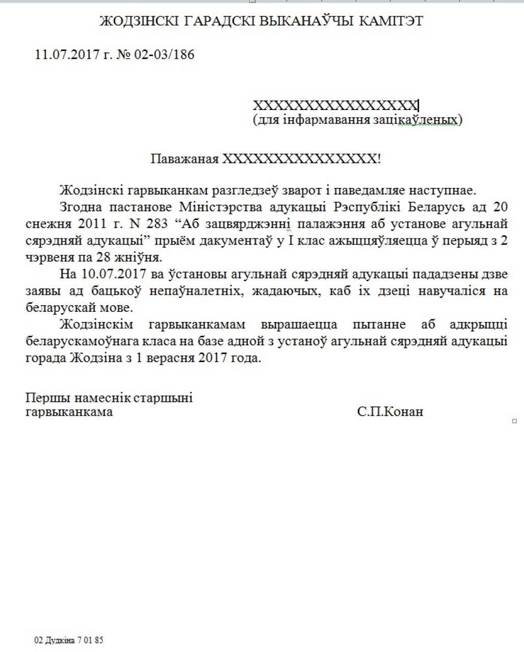 Мы, жыхары Беларусі, ведаем, што ў горадзе Жодзіна не засталося ніводнага класа з беларускай мовай навучання і што Аддзел адукацыі, спорту і турызму Жодзінскага гарадскога выканаўчага камітэта разглядае магчымасць адкрыцця класа з беларускай мовай навучання.
