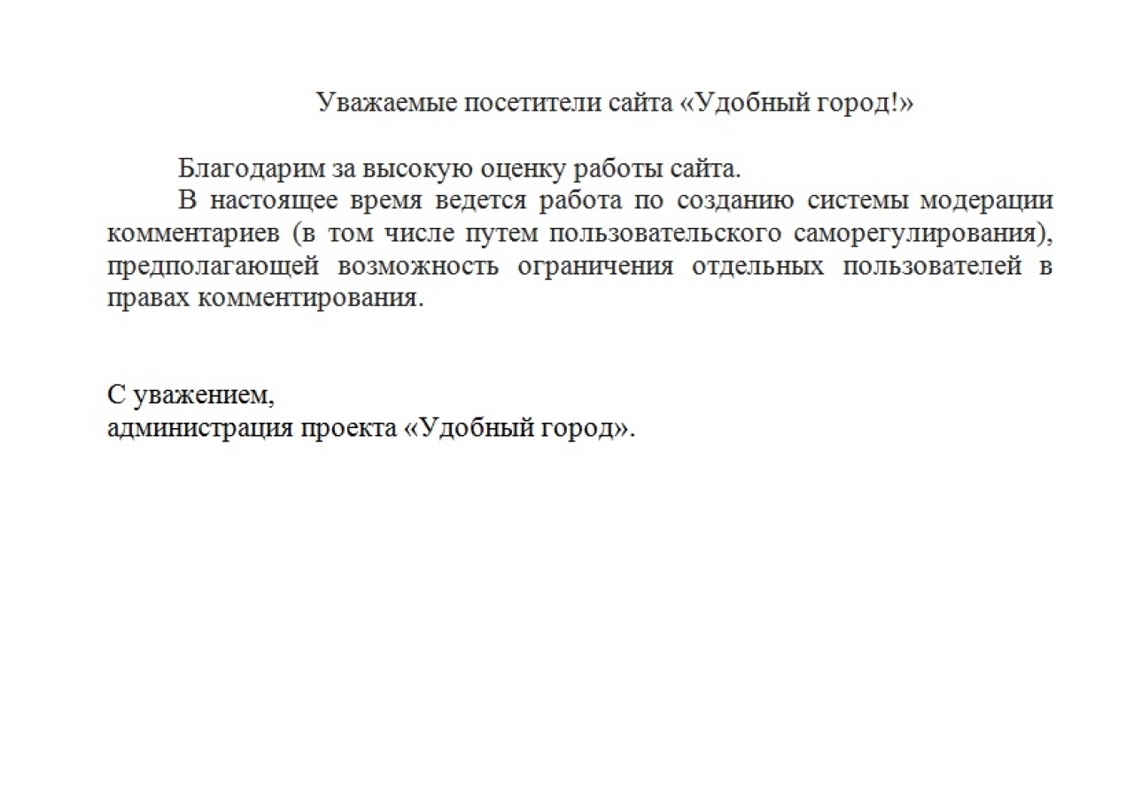 Уважаемая Администрация сайта «Удобный город», я и ниже подписавшиеся выражаем Вам большую признательность и благодарность за удобную возможность размещения, редактирования коллективных обращений.