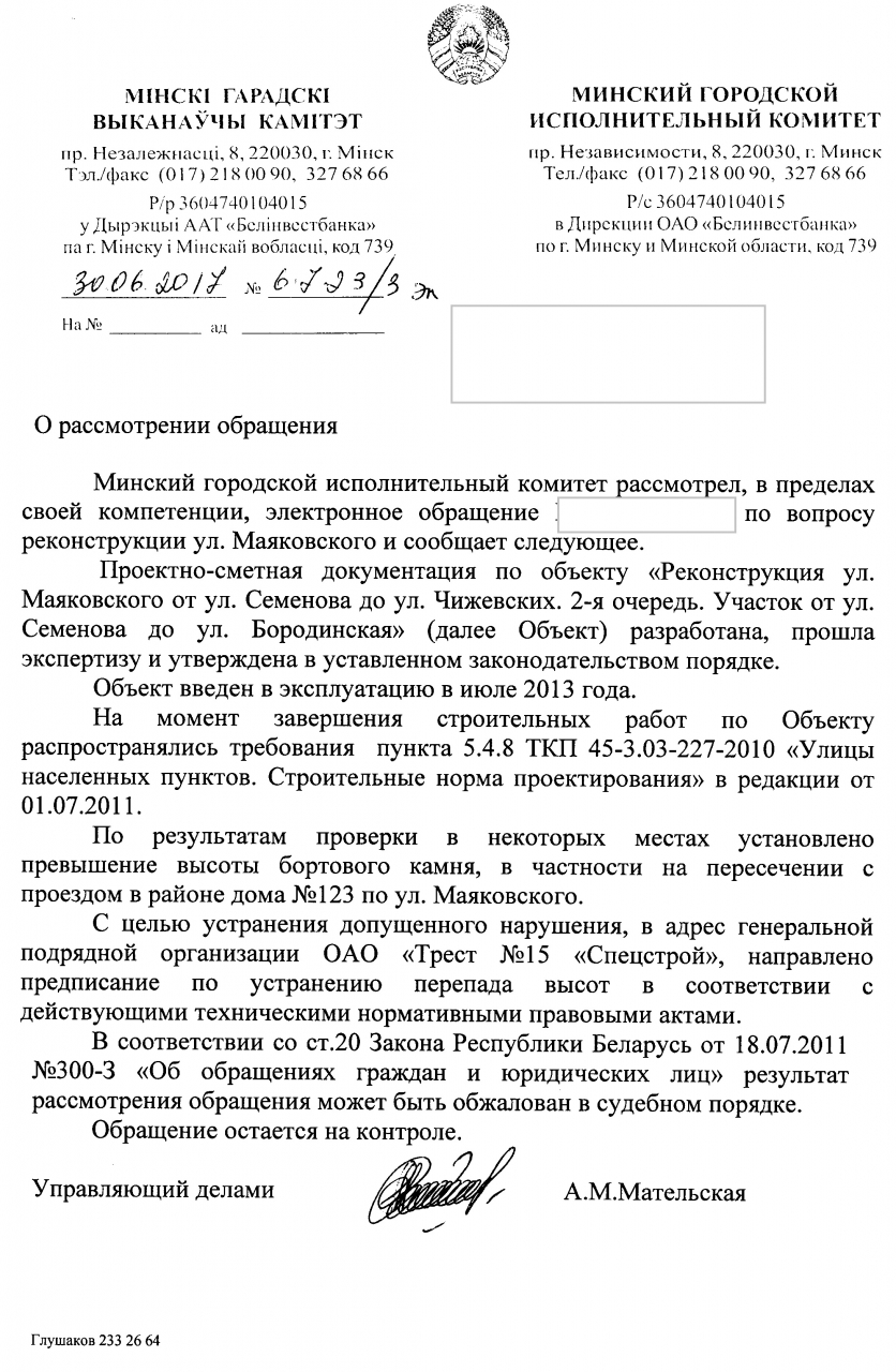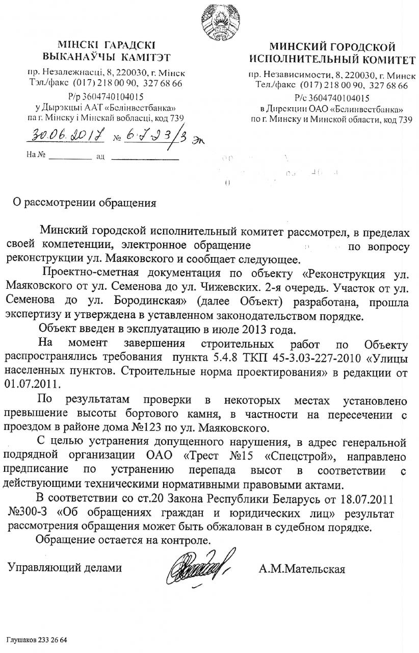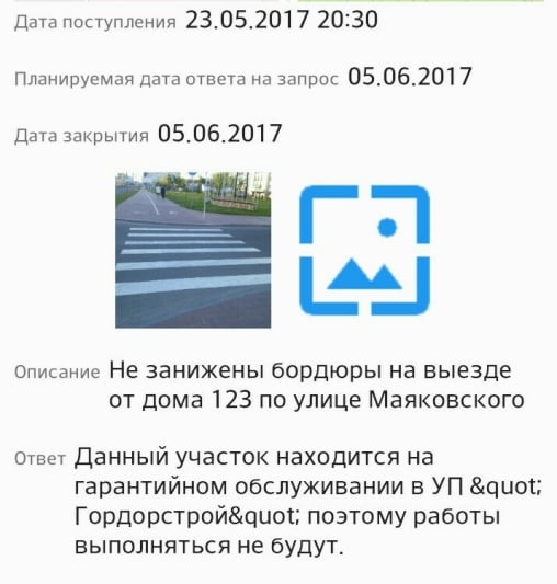 Несмотря на предварительные обещания исправить нарушения, в ответ на последнюю заявку администрация сообщила, что данный участок улицы после реконструкции находится на гарантийном обслуживании УП "Гордорстрой", поэтому работы производиться не будут.