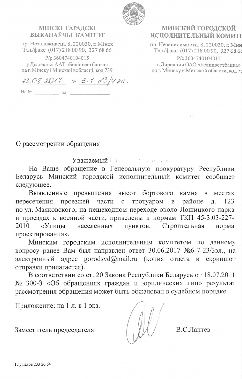 По этому поводу направлялись неоднократные обращения в администрацию Ленинского района, в том числе заявки через сайт http://115.бел/ (номера запросов 1242, 83865). Одно из самых заметных нарушений — бордюр высотой 8 см на пересечении тротуара с проездом в районе дома №123 по ул. Маяковского. Также не соответствует нормам высота бордюров на проездах к военной части, на переходе около входа в Лошицкий парк и на большинстве других пересечений.