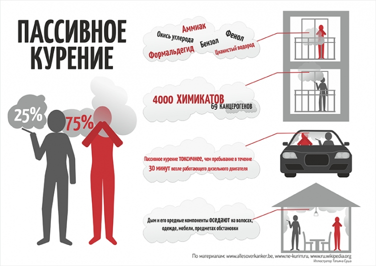 Подсчитано - курильщик вдыхает одну четвертую часть табачного дыма, возникающего при курении сигареты. Затем такая же часть выдыхается, а три четверти дыма, образовавшегося при тлении и догорании сигареты, попадают непосредственно в окружающий воздух. Некоторые токсичные вещества (формальдегид, окись азота, деготь) возникают в результате медленного тления в большей степени, чем, собственно, в процессе курения этой сигареты. Категория риска – беременные женщины, дети, хронически больные люди – в особенной степени подвержены токсическому воздействию сигаретного дыма.
