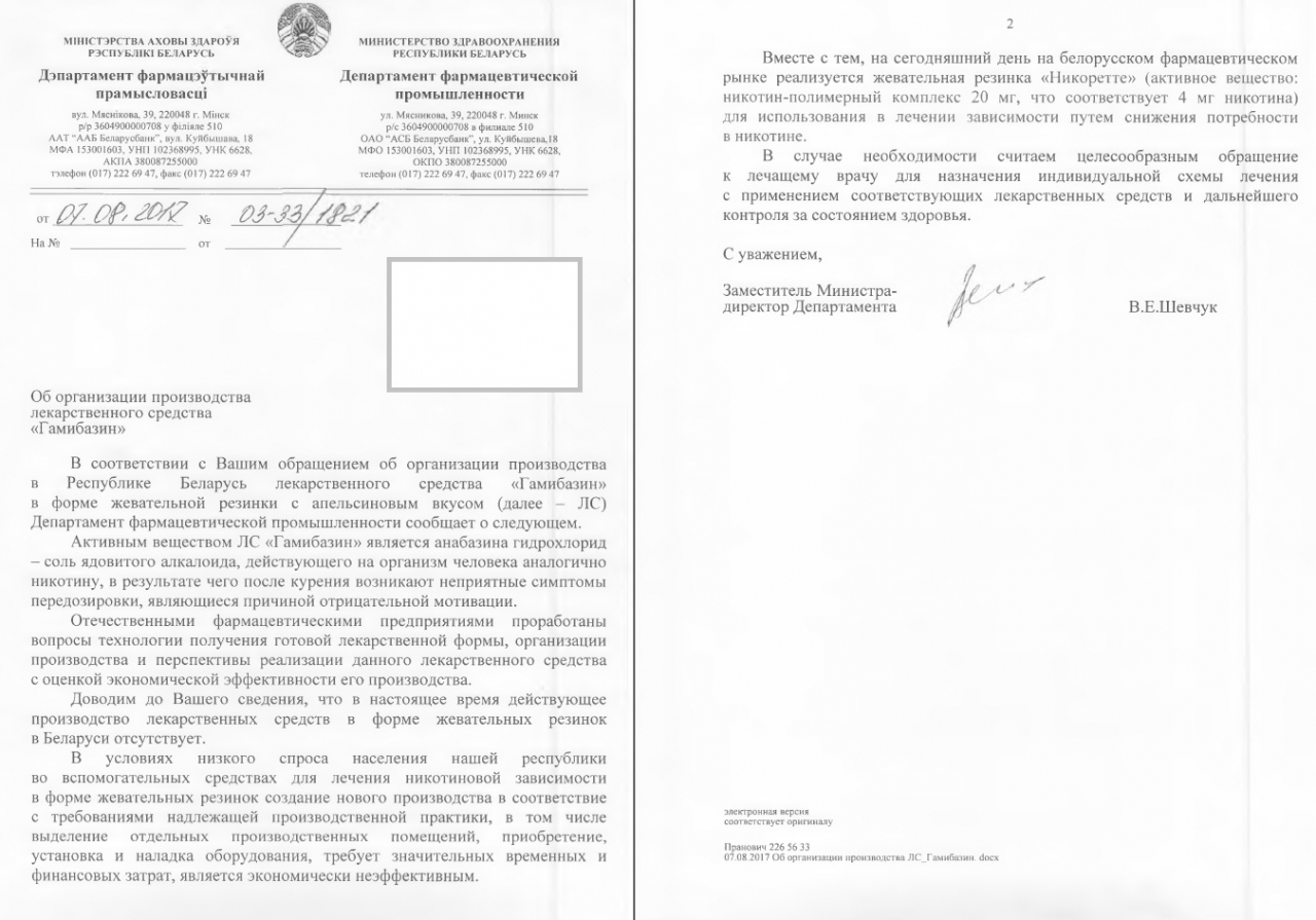Активное вещество "Гамибазина" - соль ядовитого алколоида. На белорусском рынке присутствует аналог - жевательная резинка "Никоретте".