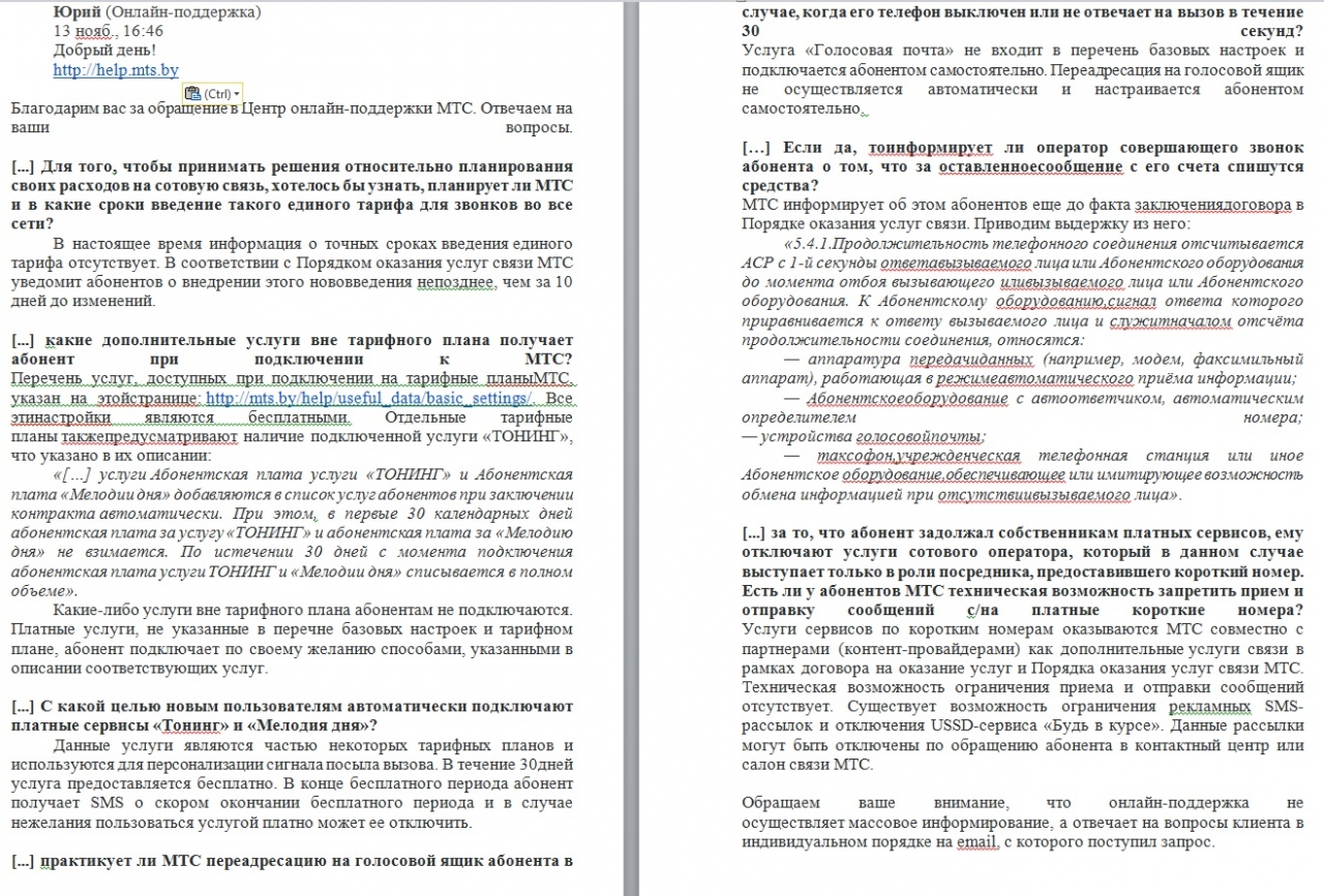 Также неоднократно в СМИ освещалась проблема подключения операторами связи услуг «по умолчанию», которые не упоминаются в тарифном плане и оказываются сюрпризом для абонента, а иногда и для звонящих ему лиц. В то же время согласно ст. 7 Закона «О защите прав потребителей» исполнитель обязан своевременно предоставлять потребителю необходимую и достоверную информацию о предлагаемых услугах, соответствующую установленным законодательством и обычно предъявляемым требованиям к содержанию и способам предоставления такой информации, в частности, такая информация в обязательном порядке должна содержать наименование услуги, виды и особенности предлагаемых услуг, сведения об основных потребительских свойствах услуг, цену и условия их оплаты. Поэтому просим предоставить полную и достоверную информацию о том, какие дополнительные услуги вне тарифного плана получает абонент при подключении к МТС? С какой целью новым пользователям автоматически подключают платные сервисы «Тонинг» и «Мелодия дня»?