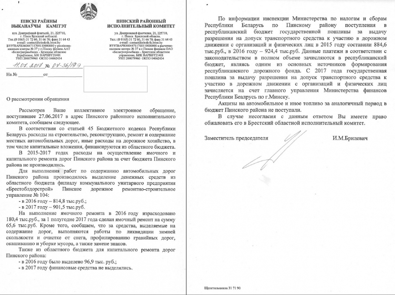 Также прошу предоставить информацию о том, какой объем денежных средств был собран по средствам уплаты юридическими и физическими лицами, индивидуальными предпринимателями, зарегистрированными на территории г. Пинска и Пинского района государственной пошлины за выдачу разрешения на допуск транспортного средства к участию в дорожном движении, а также по средствам уплаты акцизов на топливо.