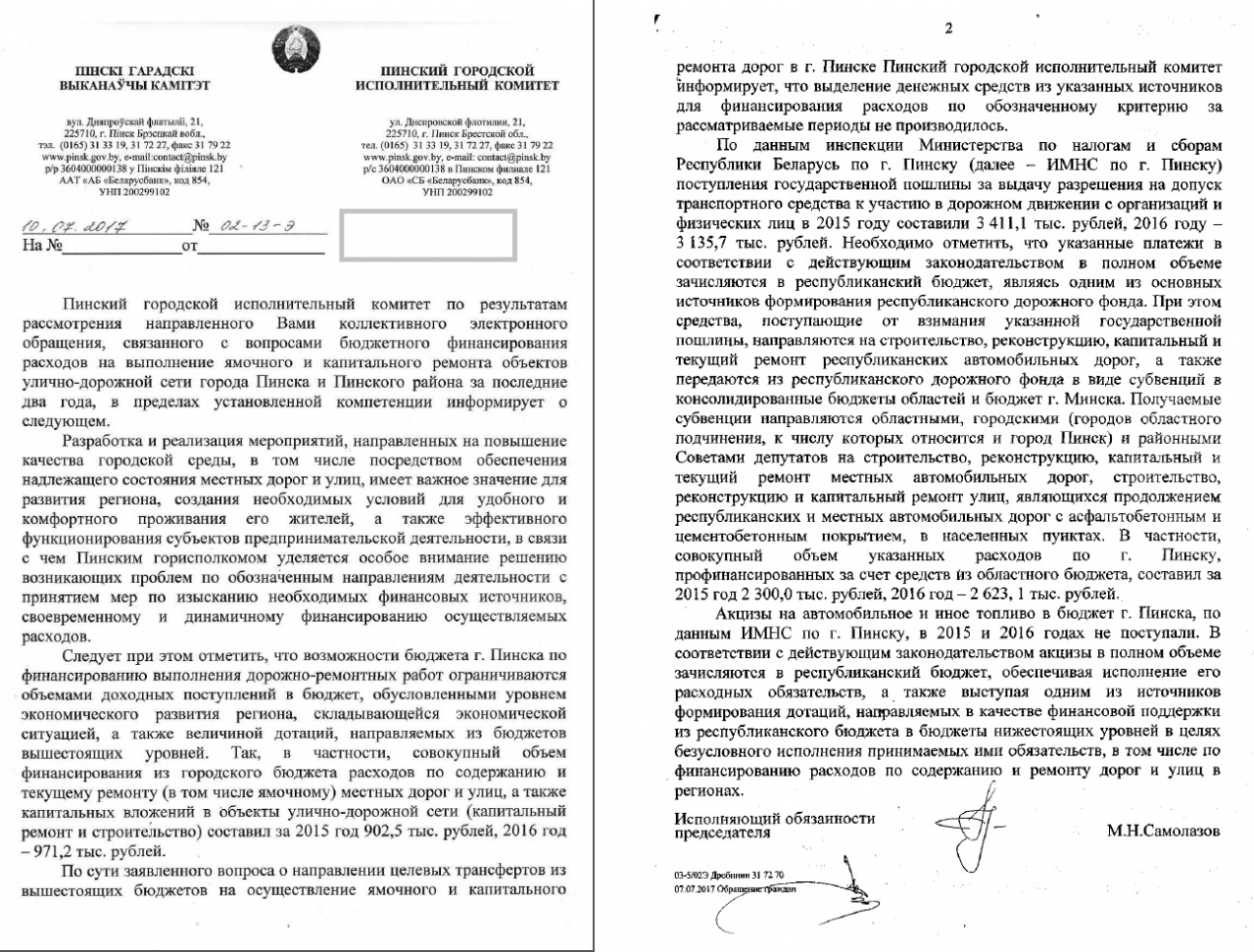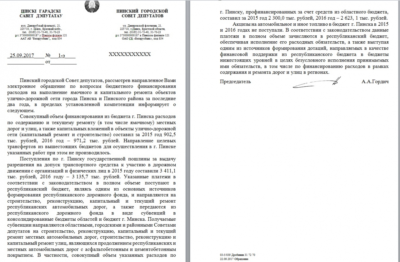 Прошу предоставить информацию о расходах районного и городского бюджетов Пинска, а также о целевых трансфертах из вышестоящих бюджетов на осуществление ямочного и капитального ремонта дорог Пинска и Пинского района за последние 2 года.
