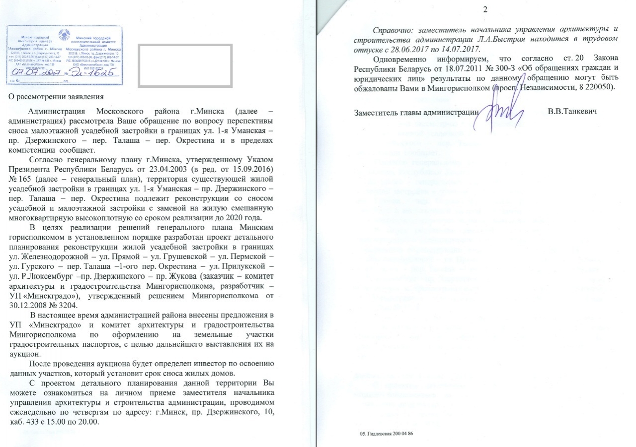 Прошу сообщить, планируется ли и если планируется, то в какие сроки снос малоэтажной усадебной застройки в границах улиц 1-я Уманская - пр. Дзержинского - пер.Талаша - пер. Окрестина. Как можно ознакомиться с перспективными планами застройки указанного района?