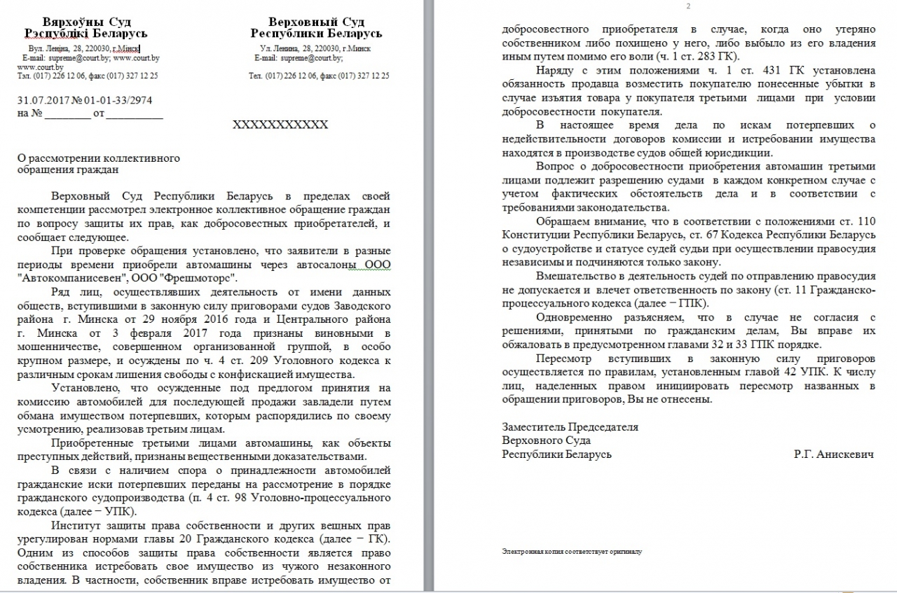 Согласно материалам по уголовному делу ООО «Автокомпанисевен» и ООО «Фрешмоторс», мы, добросовестные покупатели, приобрели в соответствии с законодательством Республики Беларусь на территории указанного государства в личную собственность легковые автомобили, зарегистрировали их на праве собственности в ГАИ, получили технические паспорта государственного образца, оплатили получение государственных номеров, страховых полисов, техосмотров.