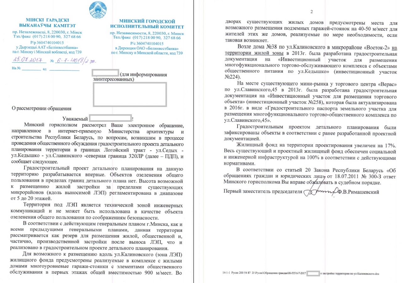 В частности, «Минскградо» предлагает построить жилой комплекс "Венеция" на месте "ЛЭП". Но на самом деле под ЛЭП расположена зеленая зона, которая используется жителями микрорайона для отдыха. Вместо зеленой зоны жители получат плотную застройку новыми домами.