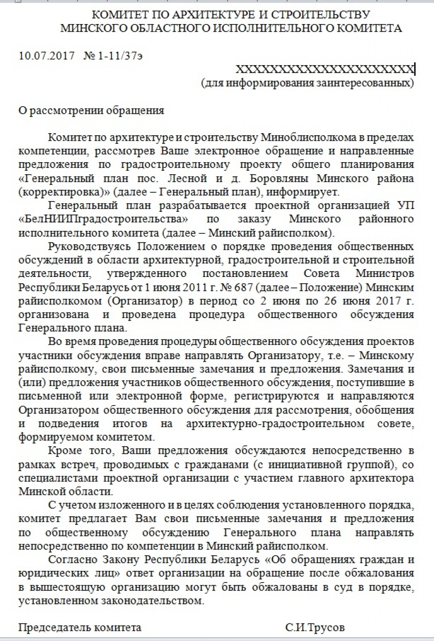В данный момент снова внесены изменения в ГЕНПЛАН!! Согласно новым изменениям в генплане 2017 года по модернизации поселка Лесной и деревни Боровляны, предложенному Администрацией района, планируется еще строительство МНОГОЭТАЖНЫХ ДОМОВ за счет вырубки около 6 гектаров леса и СТРОИТЕЛЬСТВА АВТОМАГИСТРАЛИ для которой необходим СНОС ДОМОВ. Также во многих случаях не соблюдены элементарные права частной собственности, поскольку автомагистраль пройдет по территориям частной застройки, дачного кооператива и явно предусматривает изъятие земельных участков и построенных домов.