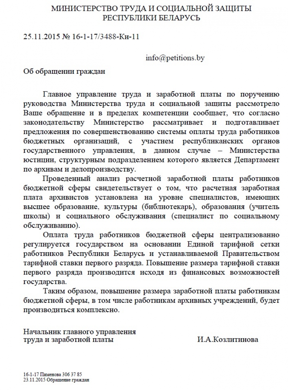 В смежных отраслях (например, в делопроизводстве), согласно анализу рынка труда, заработная плата на порядок выше (4.500.000 - 5.500.000 бел.руб.). Данный разрыв в размерах зарплат ничем не оправдан, т.к. архивному делу (как и делопроизводству) обучаются в ВУЗе 5 лет и имеют дипломы соответствующей квалификации.