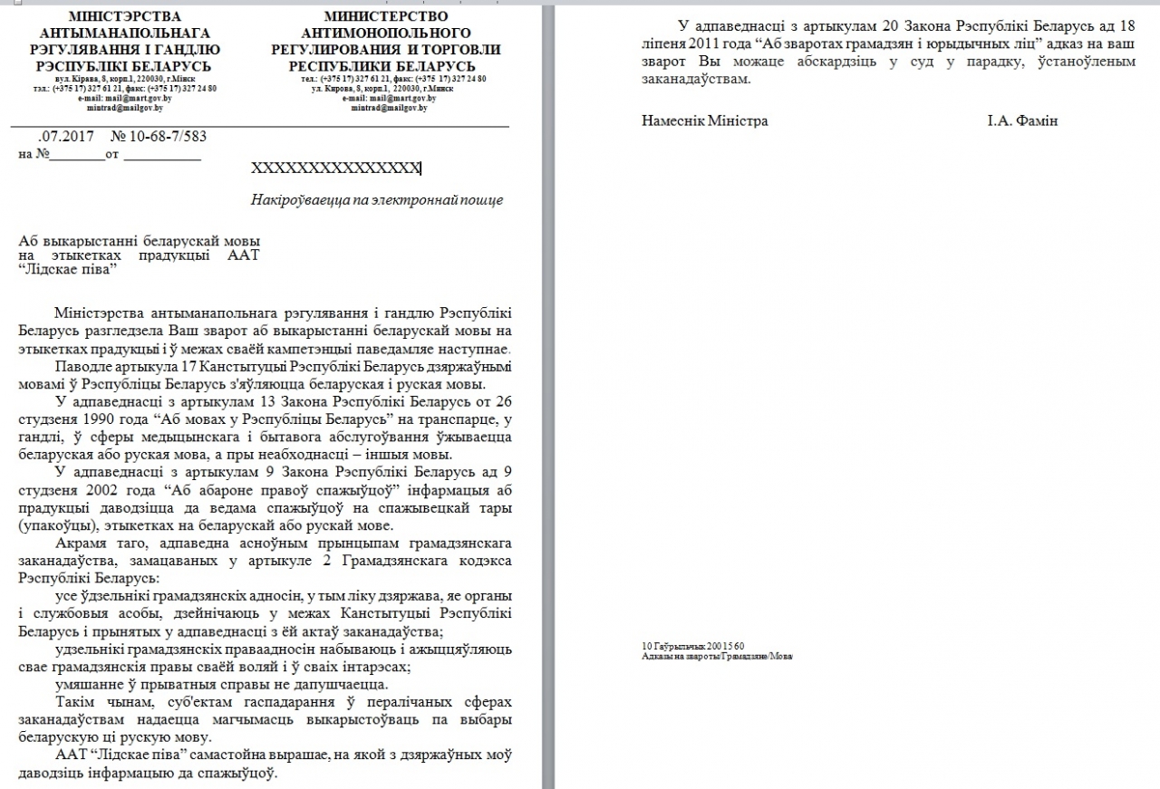 ААТ “Лідскае піва” мае права самастойна вырашаць, на якой з дзяржаўных моў даводзіць інфармацыю да спажыўцоў.