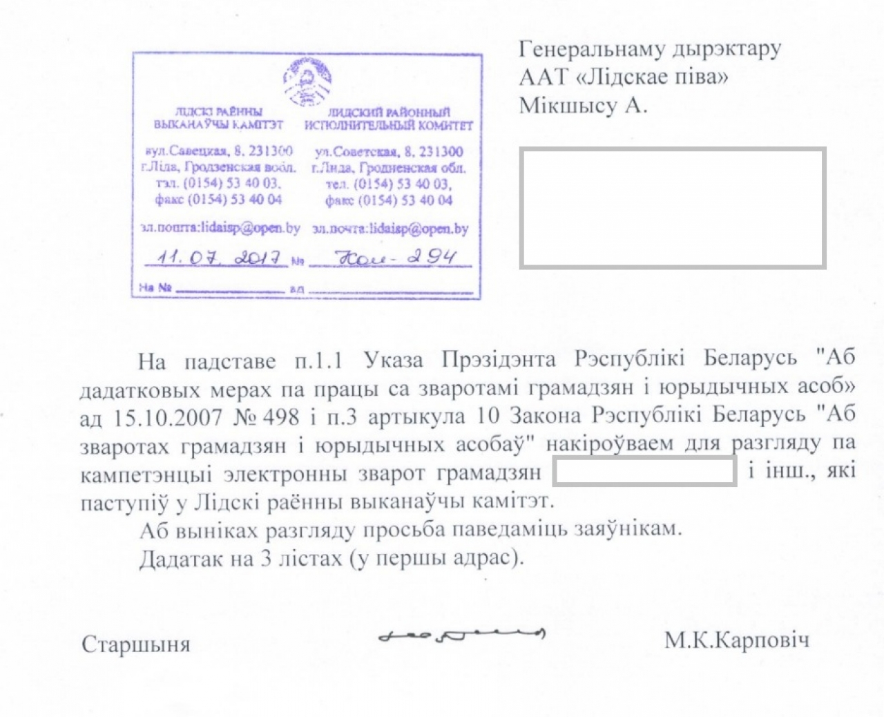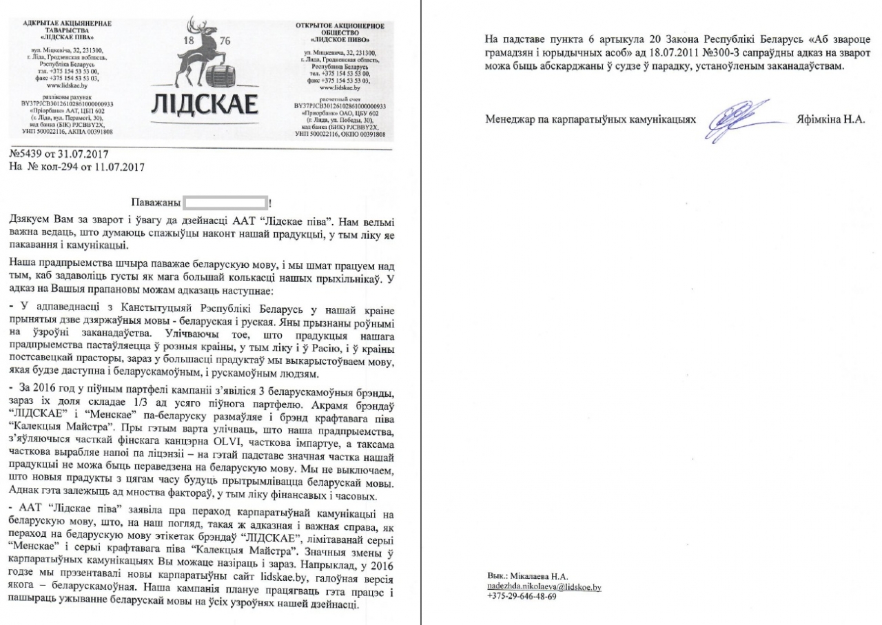 ААТ "Лідскае піва" правяло ў 2016 годзе рэбрэндынг, перавёўшы свой галоўны брэнд "Лидское" на беларускую мову. З мінулага года ўся лінейка піва пад брэндам "Лідскае" афармляецца па-беларуску,інфармацыя аб прадуктах даводзіцца і па-руску і па-беларуску, камунікацыя з пакупніком таксама вядзецца па-беларуску. Гэта навіна была вельмі станоўча ўспрынята беларускім грамадствам. Аднак "беларусізацыя" вашай кампаніі завяршылася толькі на брэндах "Лідскае" і "Менскае", на ўсіх астатніх відах прадукцыі месца для беларускай мовы не знайшлося, што вельмі прыкра. Таму просім разглядзець магчымасць дадання інфармацыі па-беларуску на этыкеткі ўсіх астатніх прадуктаў кампаніі.