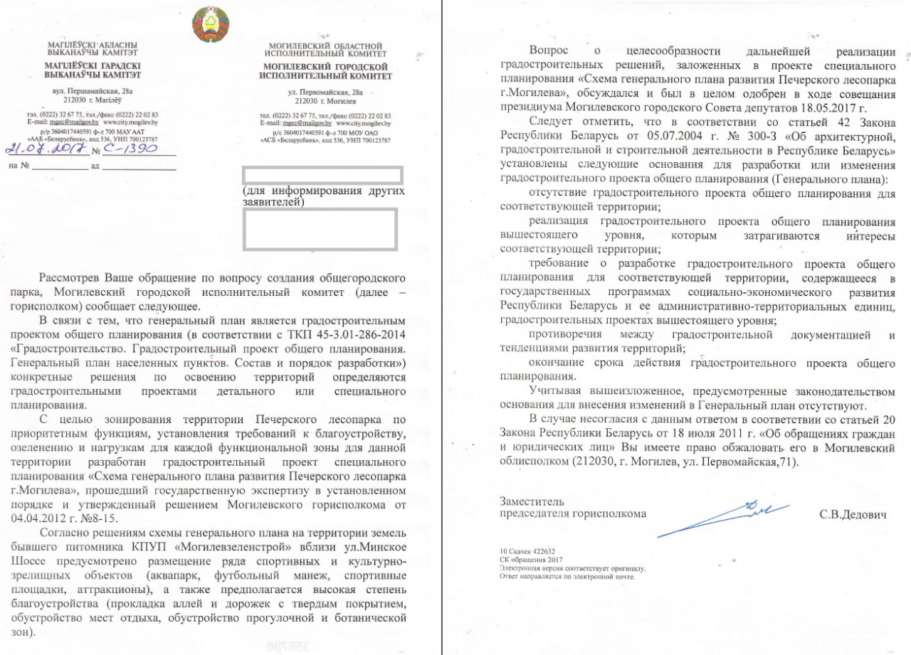 На данный момент эта территория по новому генплану развития города 2017 г., предназначена под застройку футбольного манежа, аквапарка и гостиничного комплекса. Мы не возражаем против строительства нужных городу объектов, но предлагаем вынести на обсуждение альтернативные площадки для реализации данных проектов. Иначе Могилёв лишается очередной "жемчужины", десятков гектар ценных пород деревьев, фактически готового общегородского парка!