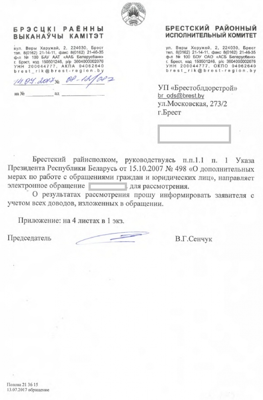 В связи с вышеизложенным и на основании Закона "О местном управлении и самоуправлении", статья 41 которого относит к компетенции исполкомов вопросы создания условий для предоставления транспортных услуг населению, просим принять меры по обеспечению защиты наших законных прав и интересов. Просим оборудовать автобусную остановку в соответствии с нормами Технического кодекса устоявшейся практики, утвержденного Приказом Министерства архитектуры и строительства Республики Беларусь.
