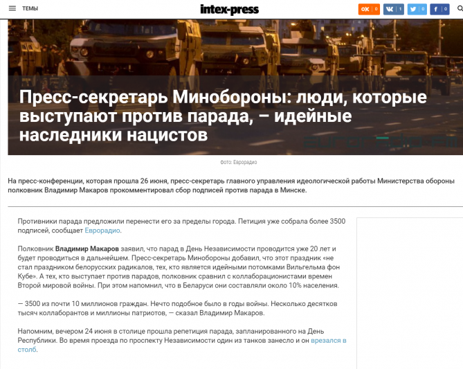 В ответ на петицию "ПРОТИВ военных парадов в пределах Минска" (https://petitions.by/petitions/762) последовала не выдерживающая никакой критики резкая реакция со стороны пресс-секретаря главного управления идеологической работы Минобороны - https://news.tut.by/society/548869.html, http://www.kp.by/online/news/2787820/, https://www.intex-press.by/2017/06/26/press-sekretar-minoborony-lyudi-kotorye-vystupayut-protiv-parada-idejnye-nasledniki-natsistov/.
