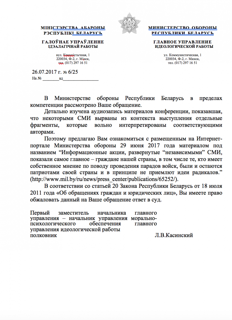 Считаем его высказывания, во-первых, наглой неприкрытой клеветой, а во-вторых, ничем не обоснованным публичным оскорблением чести и достоинства честных граждан Республики Беларусь, любящих свою страну и ее столицу. Приведенные недальновидные заявления позорят и выставляют в неприглядном свете не только их автора, но и всё Минобороны, так как по должности пресс-секретарь является лицом и голосом министерства.
