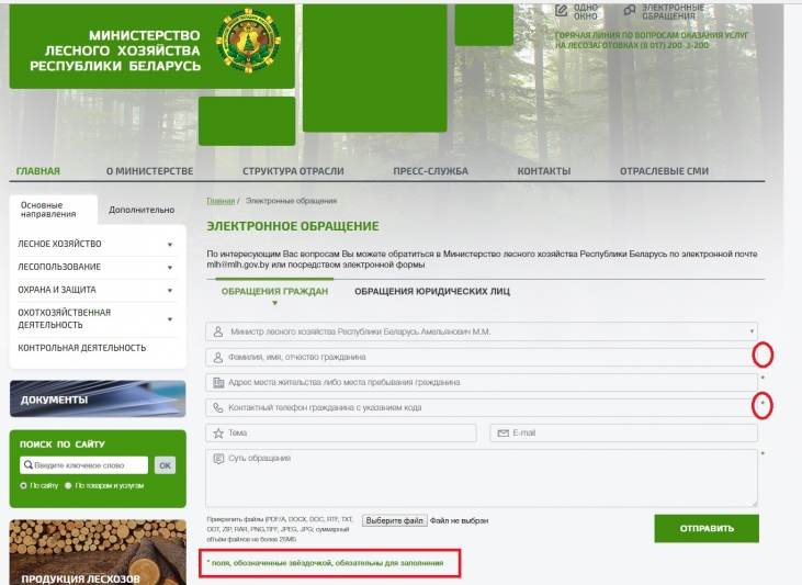 При подаче электронного обращения на сайте Министерства лесного хозяйства обязательное поле - "номер телефона", без заполнения которого обращение направить нельзя. В то же время поле "ФИО гражданина" почему-то не отмечено как обязательное.