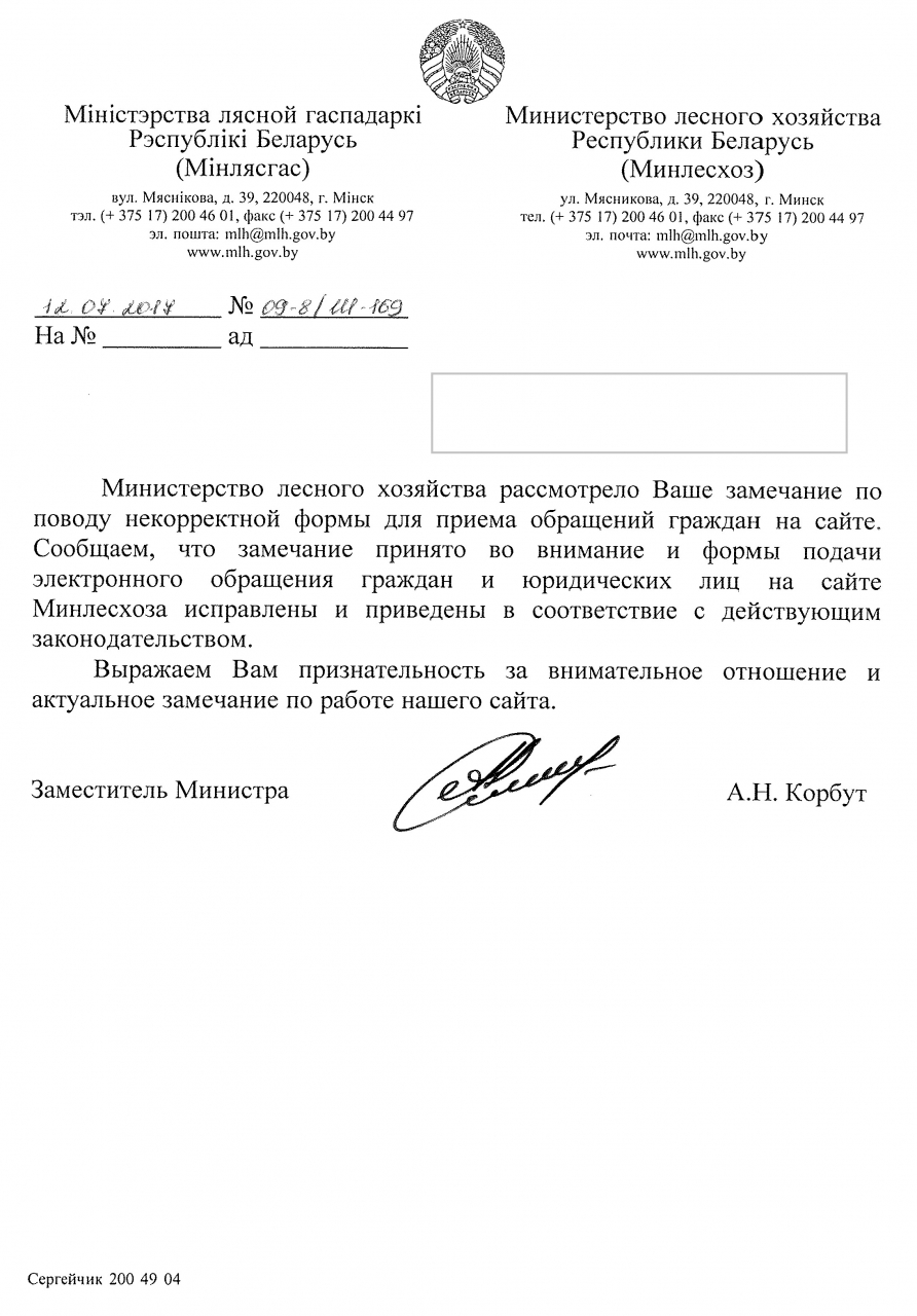 Учитывая изложенное, во избежание нарушения законодательства об обращениях граждан прошу привести форму подачи электронного обращения на сайте Министерства лесного хозяйства в соответствие с действующим законодательством, сделав поле "номер телефона" необязательным.