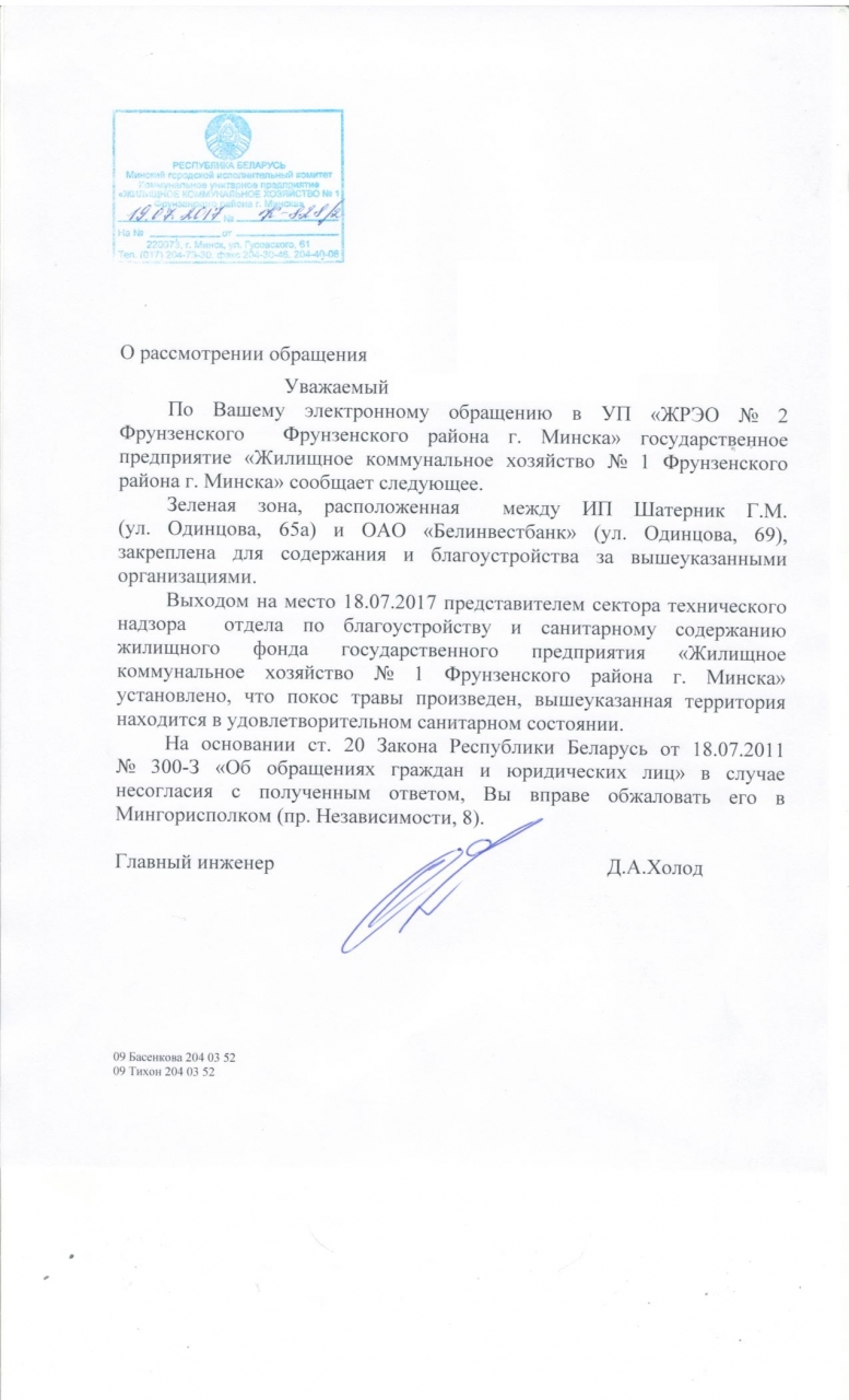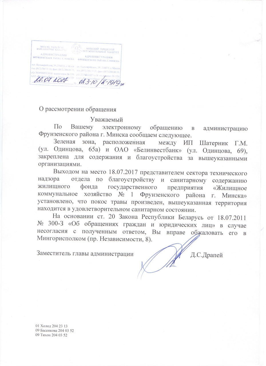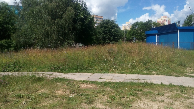 Между магазином Евроопт и зданием Белинвестбанка на улице Одинцова в Минске растет трава, уже по пояс взрослого человека выросла, а ни разу за лето ее не косили. В траве уже начала образовываться нелегальная свалка. Просим обеспечить наведение порядка на указанной территории и привлечь к ответственности виновных в его отсутствии.