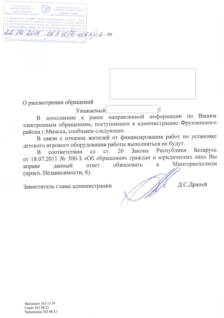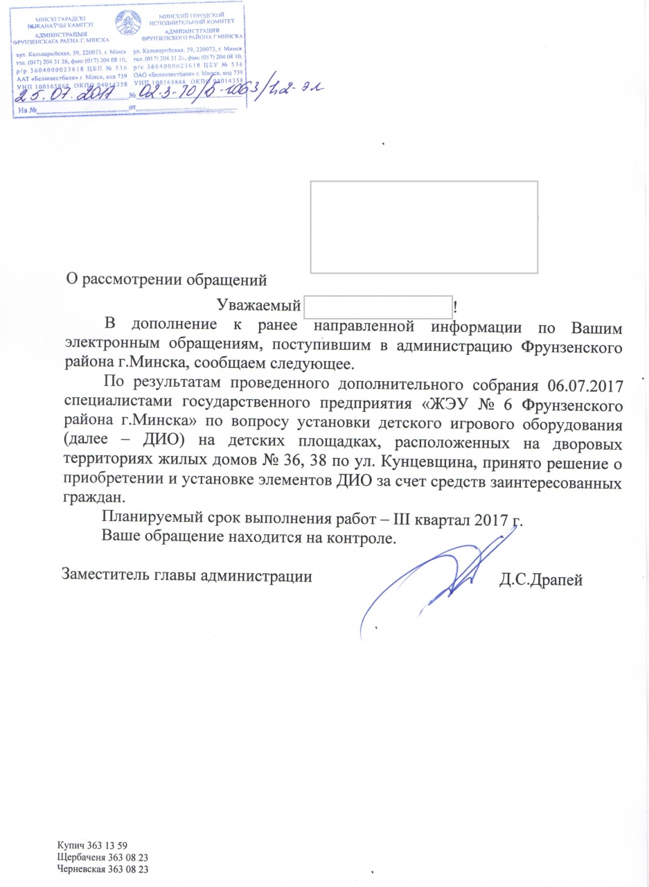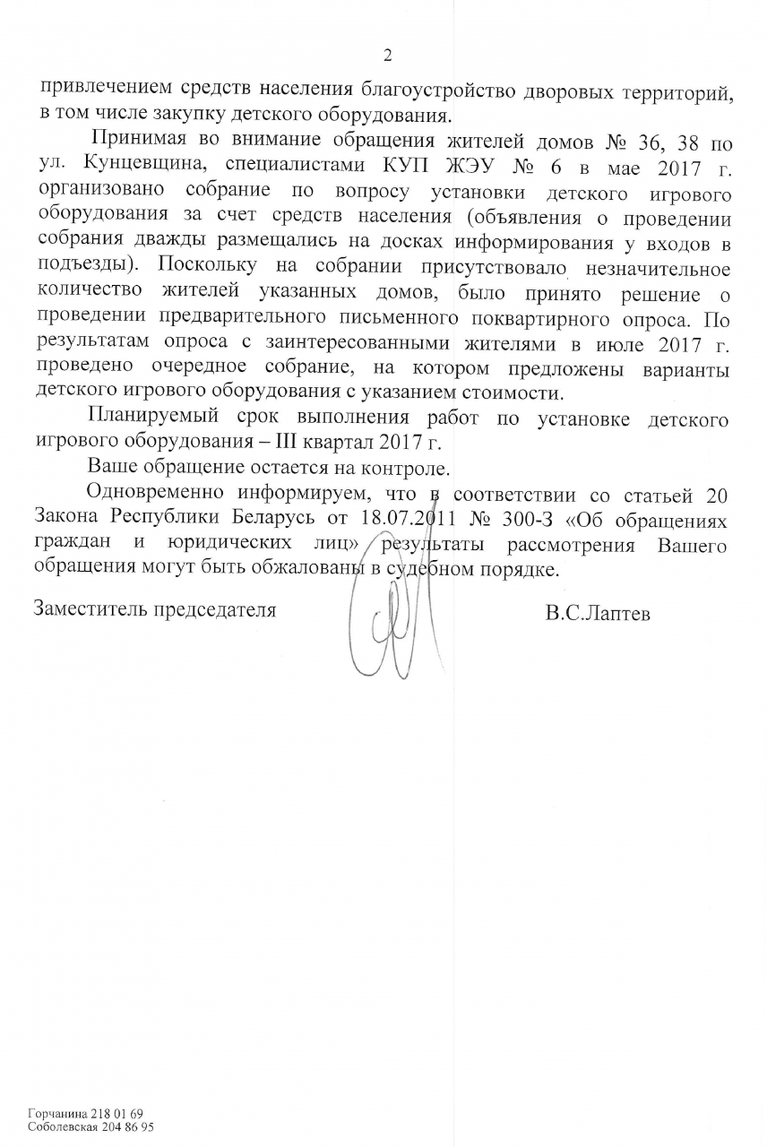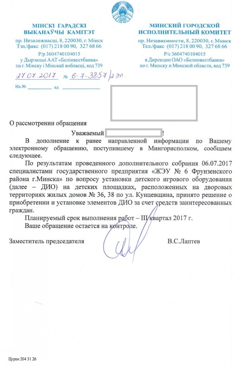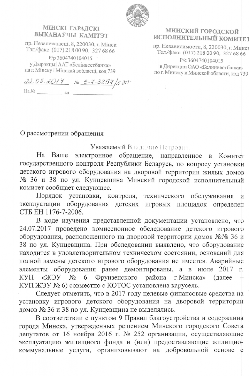 Ранее мы обращались в администрацию Фрунзенского района г.Минска и ЖРЭО по вопросу замены детского игрового оборудования на игровой площадке во дворе домов № 36, 38 по ул.Кунцевщина, однако до настоящего времени проблема не решена. Местные органы считают, что площадка находится в технически исправном и пригодном для эксплуатации состоянии и предлагают жильцам самостоятельно оплатить ее модернизацию, несмотря на то, что истекли сроки эксплуатации инвентаря.