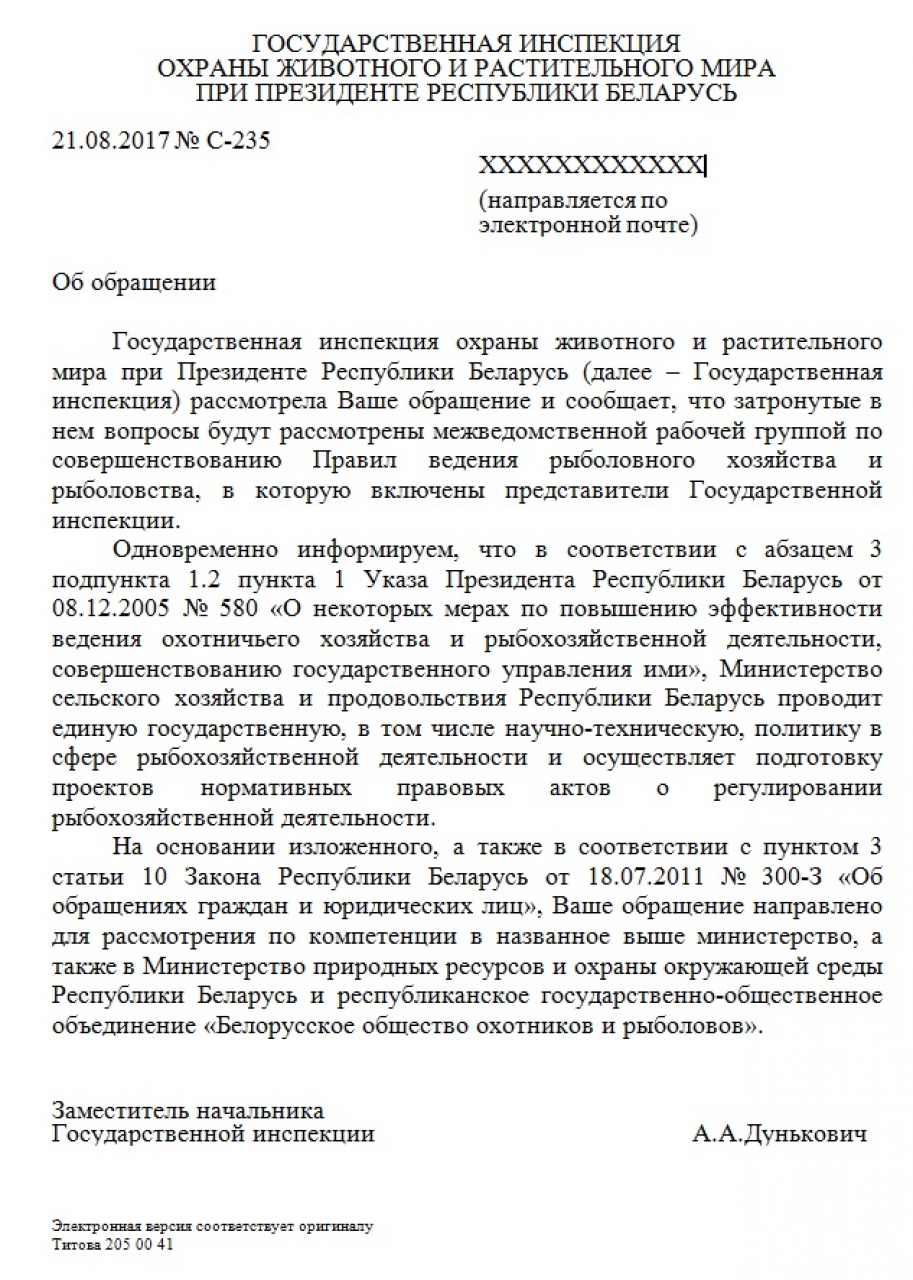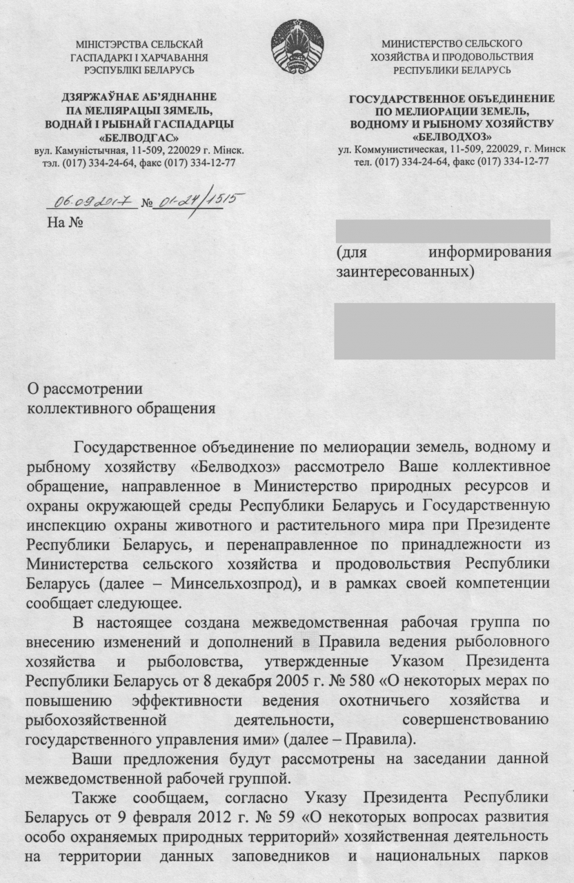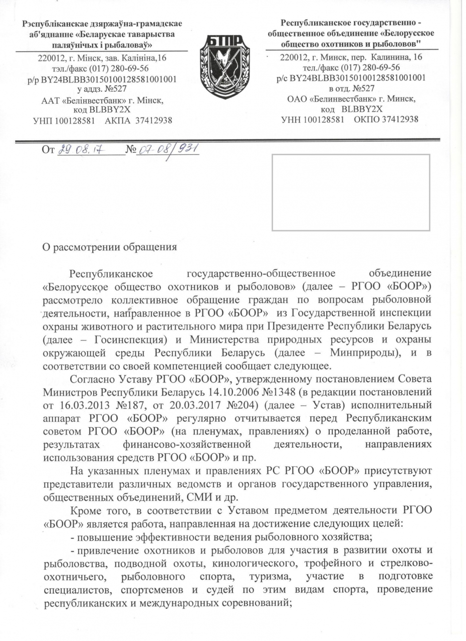 10. В следствии того, что затронутые в петиции вопросы многовекторные и требующие серьезного подхода, просим организовать общественно- консультативный совет при просим Министерстве природных ресурсов и охраны окружающей среды Республики Беларусь на постоянной основе для решения подобных вопросов с привлечением всех заинтересованных сторон. Также, просим рассмотреть вопрос о создании законодательной базы для создания и функционировании при Государственной инспекции охраны животного и растительного мира при Президенте Республики Беларусь – общественных групп дружинников из числа подводных охотников и рыболовов-любителей для совместной борьбы с нарушителями закона на водоемах и реках Республики Беларусь.
