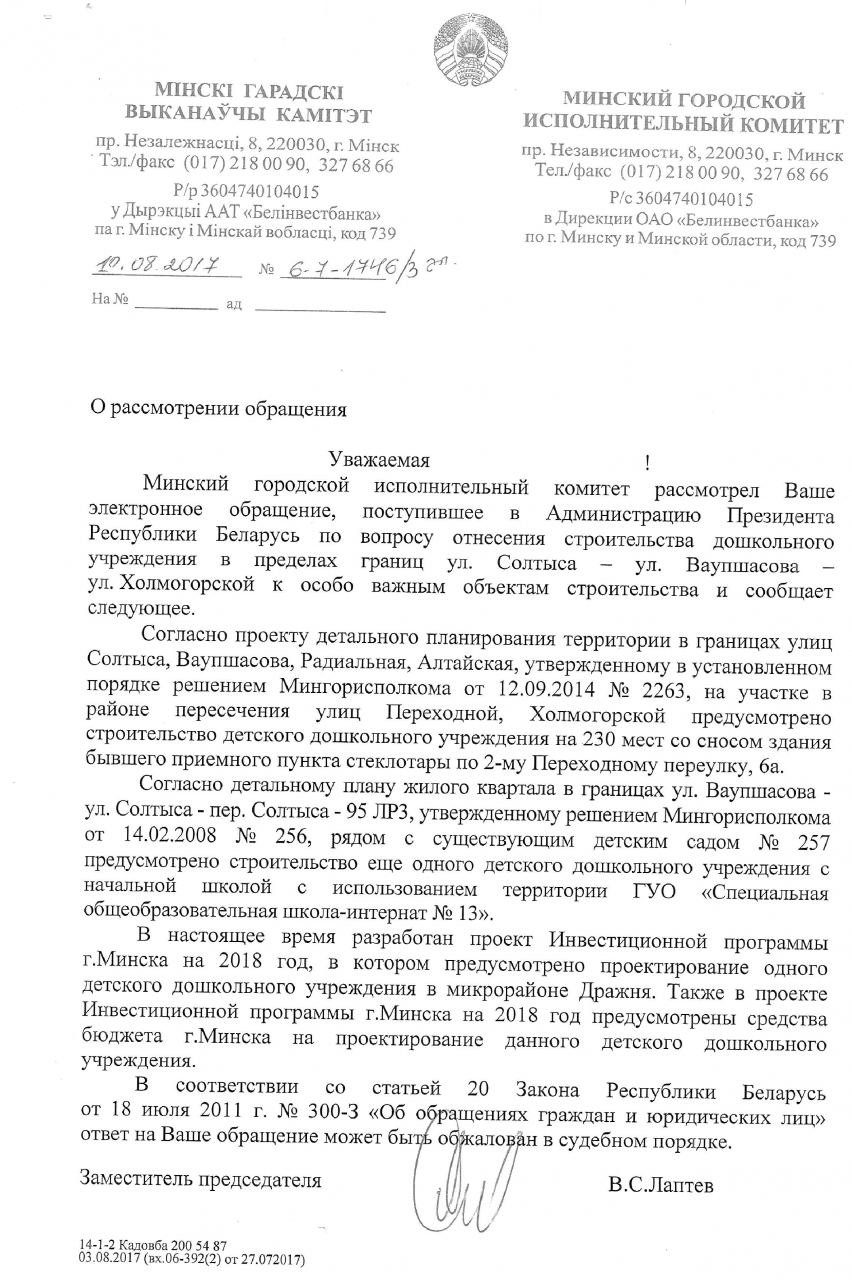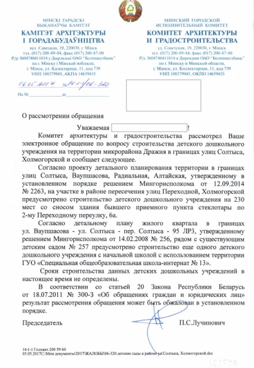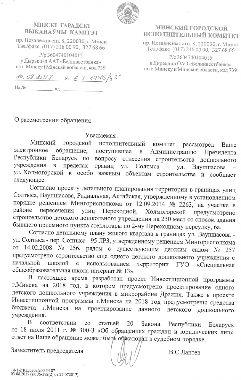 В соответствии с ответом Комитета строительства и инвестиций, а также Комитета архитектуры и градостроительства Мингорисполкома, жители микрорайона Дражня просят Главу государства отнести строительство дошкольного учреждения в пределах улиц Солтыса-Ваупшасова-Холмогорская к особо важным объектам строительства и включить данный объект в бюджет на 2018 год. Напомним, что первая территория для строительства была выделена ещё в 2008 году, вторая в 2014. Вышестоящие органы не обращают внимания на тот факт, что микрорайон застраивается, но при этом не появляется социальная инфраструктура.