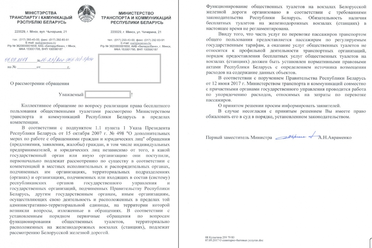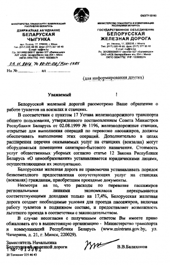 Поскольку заявления были перенаправлены вами без прочтения, полагаем необходимым вкратце описать проблему платных туалетов на вокзалах для пассажиров. Сообщаем вам, что после одного из ваших перенаправлений в Минздрав, данное министерство поддержало наше предложение по осуществлению бесплатного допуска в санузлы на вокзалах для пассажиров по билету, направив ходатайство в Минтранс о возможности реализации нашего требовательного предложения. Отмечаем, что Минтранс написал лишь отписку, о том, что у них естественная потребность и нужда пассажира в элементарных санитарно-гигиенических условиях является «сопутствующей услугой». Другими словами, застрахованный пассажир должен дополнительно платить деньги, чтобы сходить в туалет. Также министерство отметило, что закон не обязывает пускать пассажиров в туалет бесплатно. Они не заинтересованы в решении данной проблемы, прекратили переписку, сославшись на то, что все ответы они дали ранее и в проблеме не открылись новые обстоятельства. Однако они ответили не на все вопросы, также проигнорировав новые обстоятельства. А это лишний раз подтверждает, что Минтранс просто решил умыть руки, наверное, считая, что разорится, если туалет для пассажира по билету на вокзале будет бесплатным. Такое чувство, что вся железная дорога держится на плаву благодаря платным туалетам для пассажиров. Стоит заметить, что в первом своем ответе они обнадежили что наше предложение будет принято во внимание при разработке изменений и дополнений в правила. Но после того как они поняли, что людям мало просто обещаний, Минтранс просто спустил всё на тормозах, прекратив переписку, надеясь, что всё на этом закончится. Однако прекращение переписки не помешало нам поднять проблему на более высокий уровень и найти заинтересованные ведомства и неравнодушных высокопоставленных чиновников.