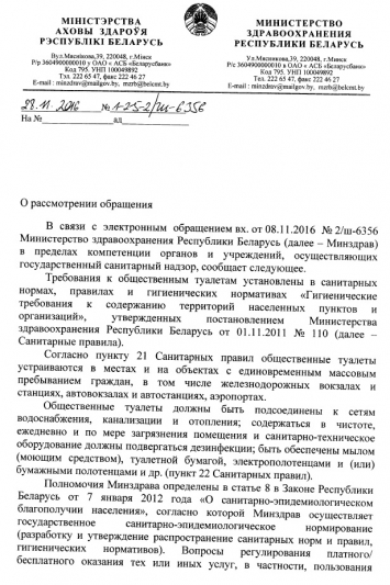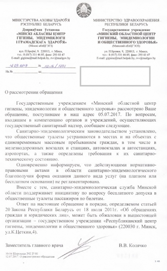 2. Минский областной центр Гигиены и эпидемиологии и общественного развития отметил, что действительно санитарные и гигиенические условия законодательно не урегулированы и в них не прописано, что они должны быть бесплатными для пассажиров. В данной связи они поддержали нас, в данной проблеме они также заинтересованы и считают, что туалеты для пассажиров на вокзалах должны быть бесплатными по предъявлению действительного билета.