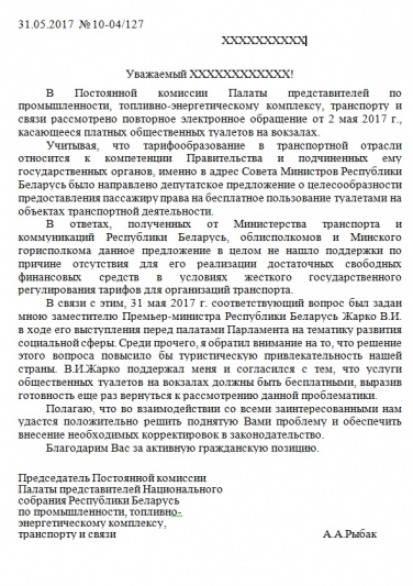 3. 31.05.2017 данная проблема была поднята Палатой представителей Национального Собрания, в лице председателя Постоянной комиссии по промышленности, топливно-энергетическому комплексу, транспорту и связи – Рыбаком Андреем Анатольевичем. Член Совета Палаты представителей Андрей Анатольевич Рыбак добавил в частности, что решение данной проблемы повысило бы также туристическую составляющую нашей страны. Вместе с тем приведен пример Российской федерации и Украины, где туалет по билетам для пассажиров на вокзалах бесплатный.
