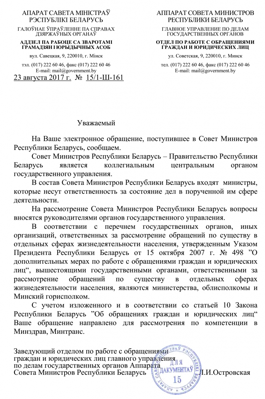 В первом своем ответе по данной проблеме Минтранс заверял и обещал, что предложение будет учтено при разработке проекта постановления Совета Министров о внесения изменений в Правила.