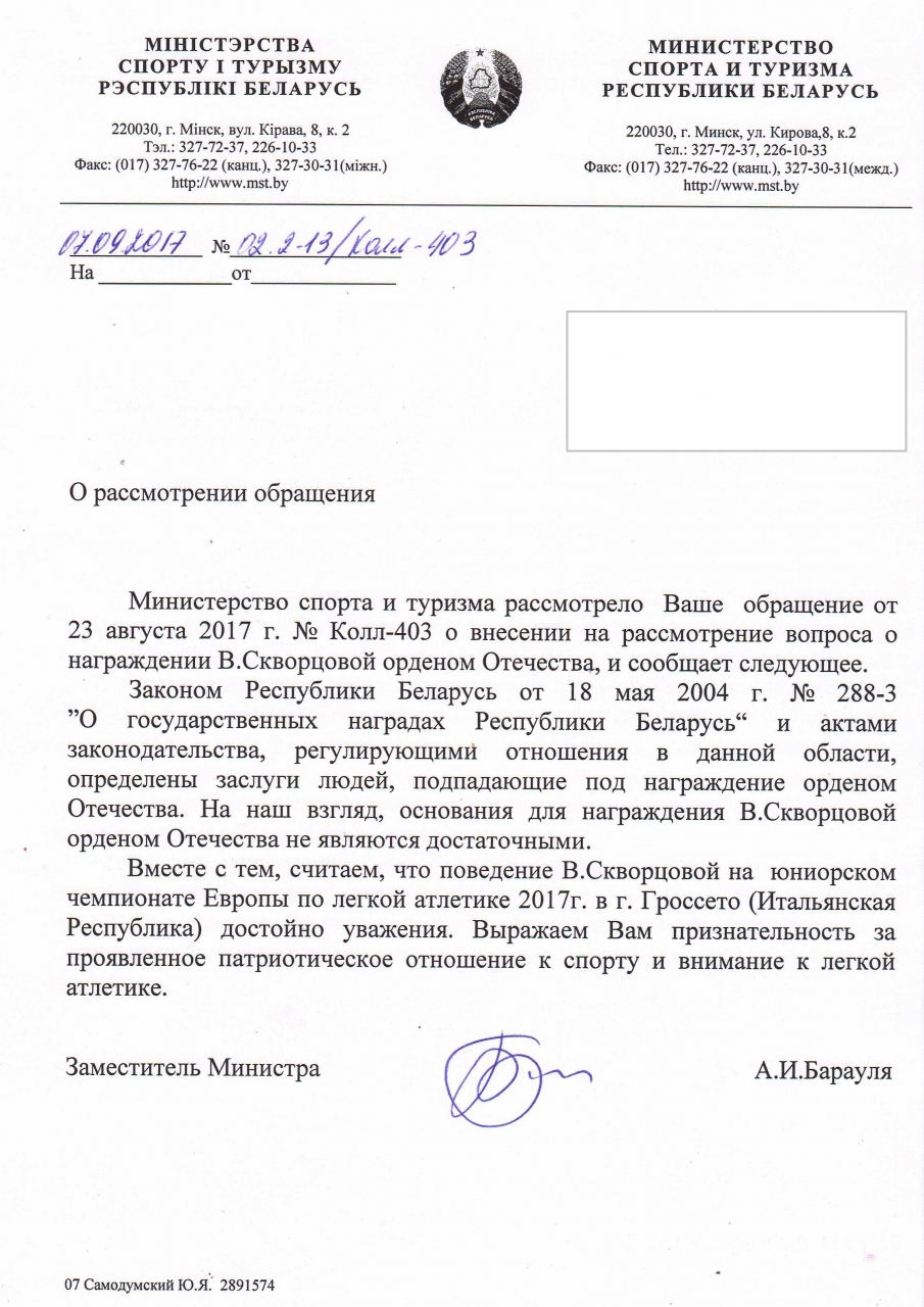 Учитывая заслуги перед отечественным и мировым спортом, действительное и патриотичное отношение к своей Родине, предлагается внести на рассмотрение Администрации Президента и лично Президента Республики Беларусь А.Г.Лукашенко вопрос о награждении В.Скворцовой Орденом Отечества!