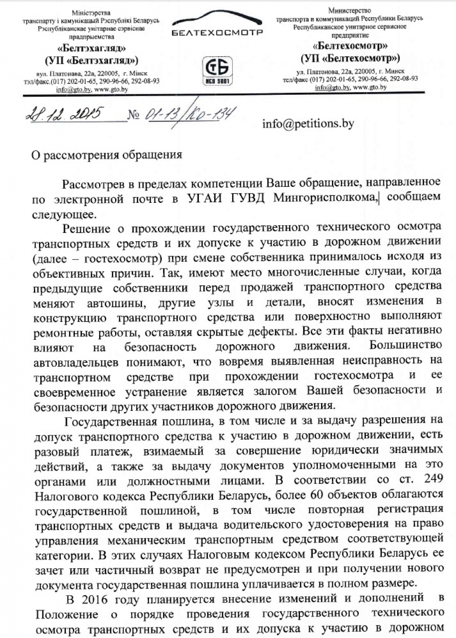 В настоящее время порядок прохождения государственного техосмотра автомобилей (далее – ГТО) регламентируется Положением о порядке проведения государственного технического осмотра транспортных средств и их допуска к участию в дорожном движении, утвержденным Постановлением Совета Министров Республики Беларусь от 30 апреля 2008 г. № 630 (далее - Положение).