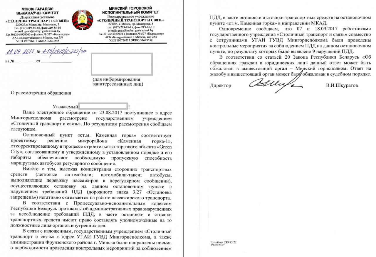 Ситуация с транспортным потоком на остановке ст. м. Каменная Горка в сторону МКАД в утренние часы представляет собой коллапс! Автобусы общественного транспорта вынуждены останавливаться во втором ряду и выпускать пассажиров прямо между припаркованными "маршрутками" и автобусами пригородных маршрутов! Были случаи, когда люди чуть не попадали под колеса трогавшихся с места авто при выходе из транспорта... Нередки случаи, когда пригородные "маршрутки стоят на останове по 15 минут, тем самым нарушая все правила и нормы, не уступают место для подъехавшего городского транспорта, блокируют выезд уже приехавшему автобусу - паркуясь перед ним в десятках сантиметров. Нужно срочно разделить места остановки пригородного и городского транспорта, что вполне возможно при наличии того места, которое имеется в данном месте!