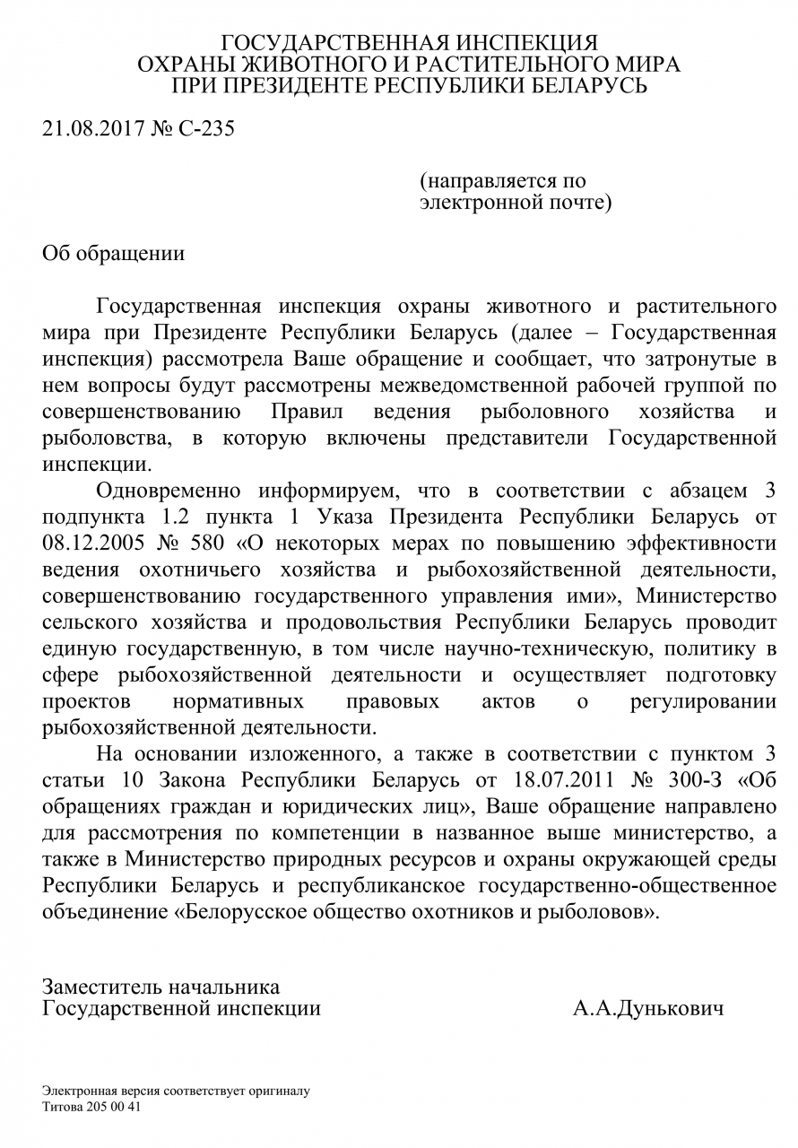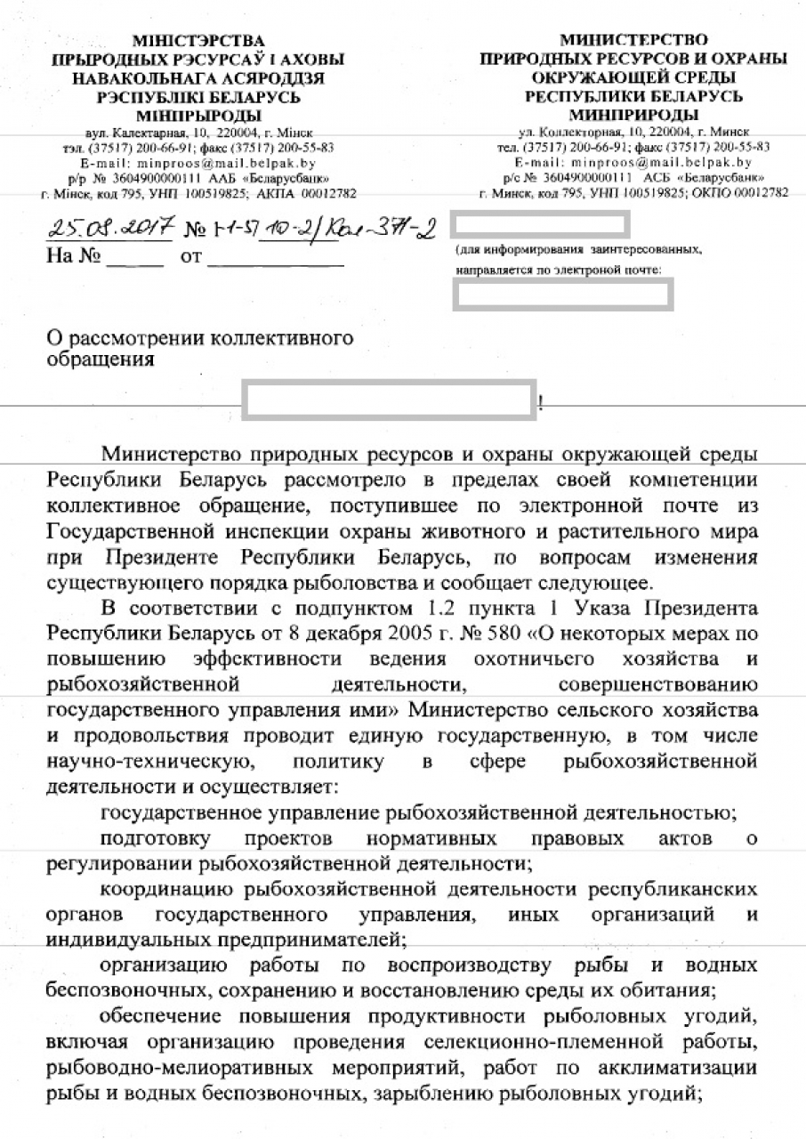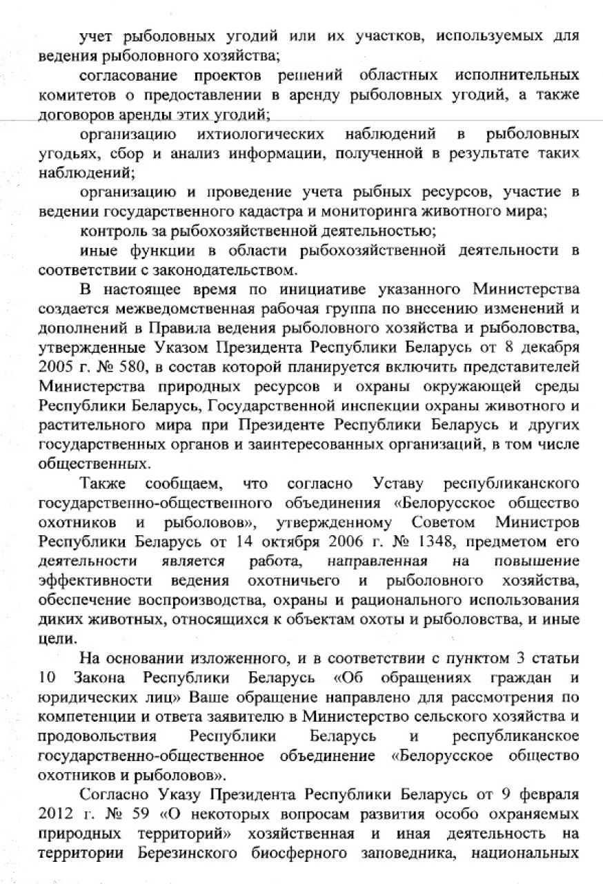 Ваше обращение также направлено для рассмотрения по компетенции в Министерство сельского хозяйства, а также в Министерство природных ресурсов и охраны окружающей среды Республики Беларусь и республиканское государственно-общественное объединение «Белорусское общество охотников и рыболовов»