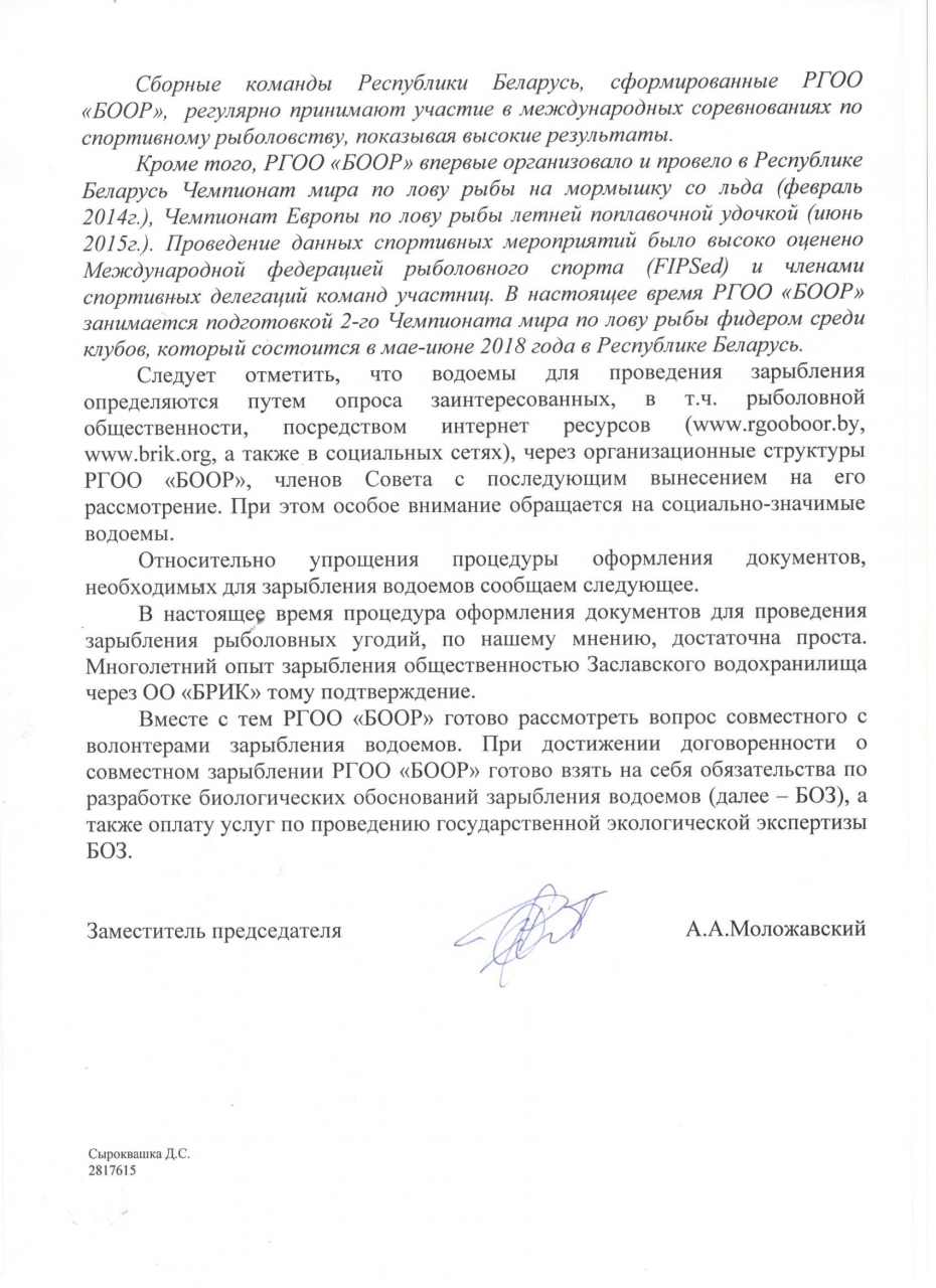 7. Вследствие того, что затронутые в обращении вопросы многовекторные и требуют серьезного подхода, просим организовать общественно-консультативный совет при Министерстве природных ресурсов и охраны окружающей среды Республики Беларусь на постоянной основе для решения подобных вопросов с привлечением всех заинтересованных сторон. Также просим рассмотреть вопрос о создании законодательной базы для создания и функционирования при Государственной инспекции охраны животного и растительного мира при Президенте Республики Беларусь – общественных групп дружинников из числа подводных охотников и рыболовов-любителей для совместной борьбы с нарушителями закона на водоемах и реках Республики Беларусь.