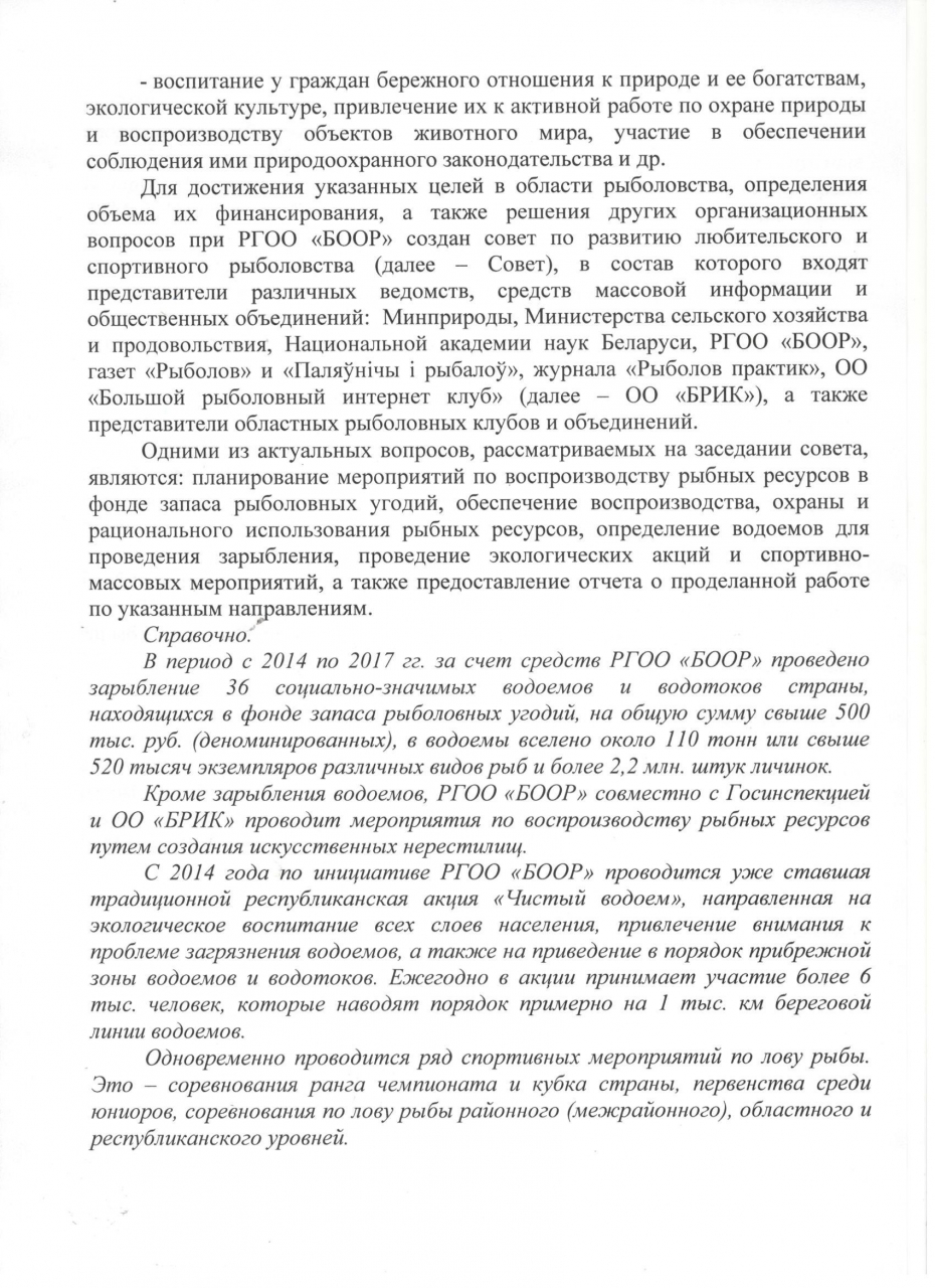 3. Продумать «прозрачную» систему ежегодного зарыбления водоемов. Также сделать «прозрачным» механизм освоения финансов, полученных со штрафов. Штраф состоит из двух статей: первая часть – за само правонарушение; вторая часть, самая крупная – за ущерб, нанесенный природе. Из названия этого штрафа следует, что деньги, полученные по этой статье, должны идти на восстановление поголовья рыб. На сайте инспекции нигде нет отчетности об освоении этих средств. (К примеру, есть доклад о том, что в 2016 на Лепельских озерах поймали двоих раколовов, которые превысили норму вылова и нанесли огромный ущерб, но совершенно нигде нет отчетности, что в Лепельские озера за деньги, взятые с этих раколовов, выпустили мальков раков или сделали что-то для этого озера и на это потрачено столько и столько.)