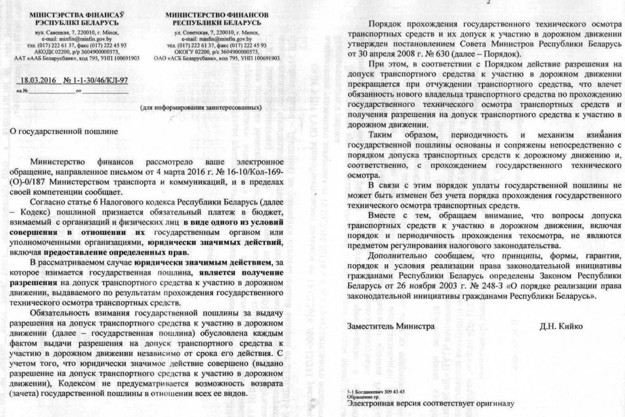 2) плательщик, уплативший государственную пошлину, отказывается от выдачи разрешения на допуск транспортного средства к участию в дорожном движении до обращения в УП "Белтехосмотр";