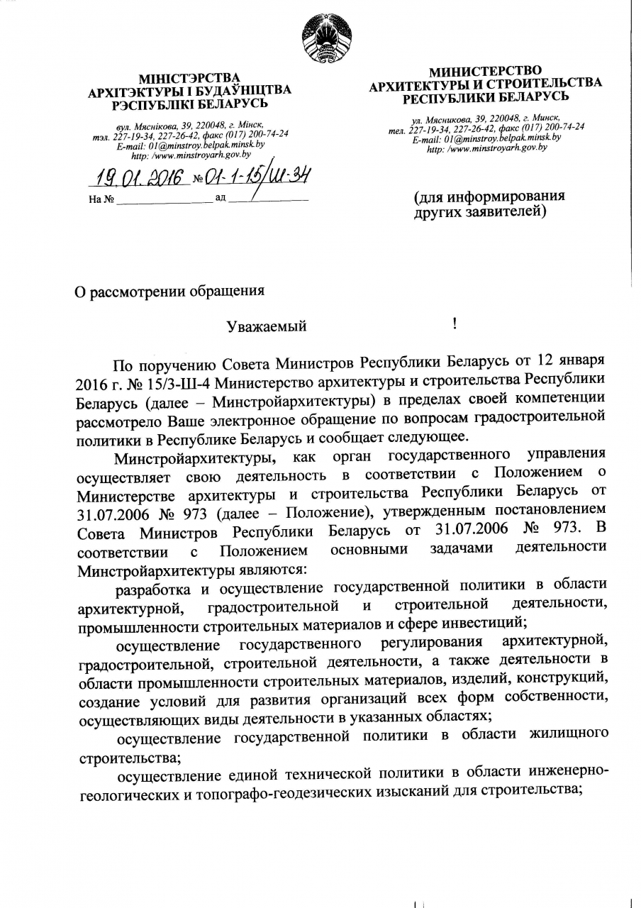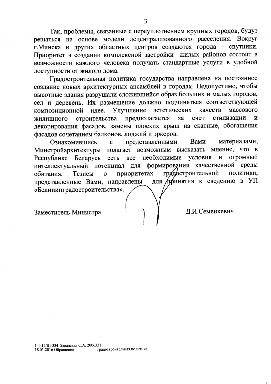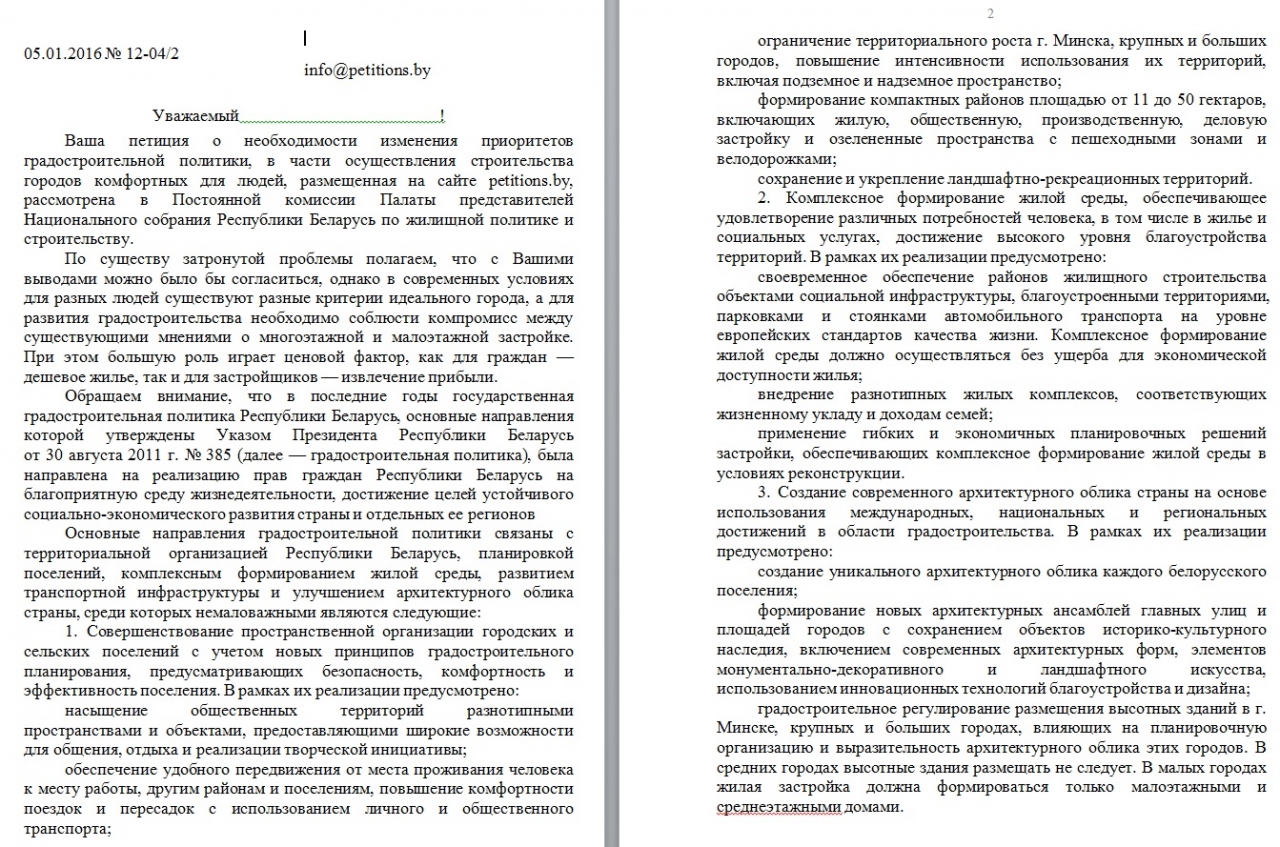 Мы, граждане Беларуси, хотим чтобы наши города были лучшими в мире и поэтому считаем, что необходимо срочно изменить приоритеты градостроительной политики. Мы считаем, что ситуация позволяет это сделать, давно остались в прошлом послевоенные годы, когда речь шла о крыше над головой, пришло время озадачится качеством, а не количеством. Считаем, что необходимо определить облик идеального города и всё новое строить в соответствии с этим идеалом. Для этого Палата представителей (в сотрудничестве с Минстройархитектуры) должна внести изменения в законодательные акты определяющие градостроительную политику таким образом, чтобы строительство, не соответствующее описанным идеалам было невозможным.