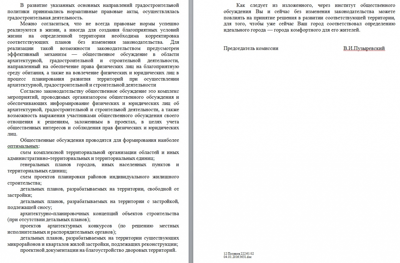 Вы и сейчас без изменения законодательства можете повлиять на принятие решения в развитии соответствующей территории через институт общественного обсуждения, для того, чтобы уже сейчас Ваш город соответствовал определению идеального города — города комфортного для его жителей