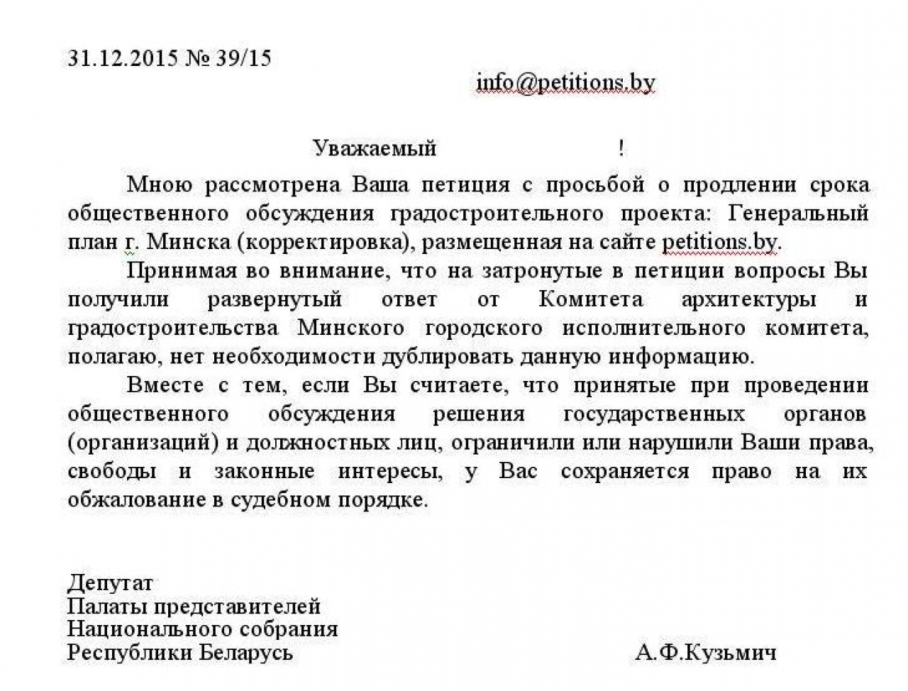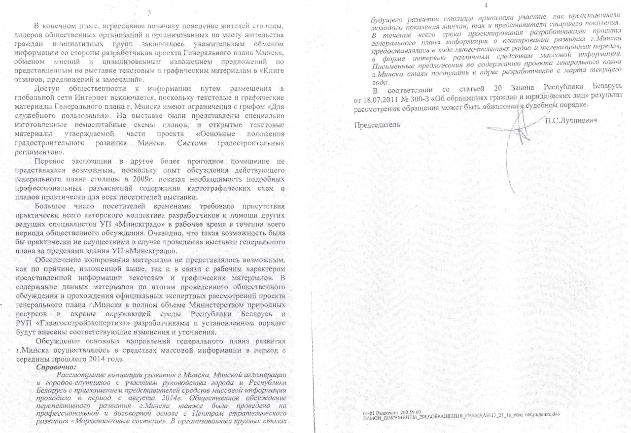 С учетом ограниченного доступа общественности к информации, которая является предметом общественных обсуждений Генерального плана г. Минска (корректировка), предлагаем принять к организаторам общественных обсуждений меры прокурорского реагирования, направленные,