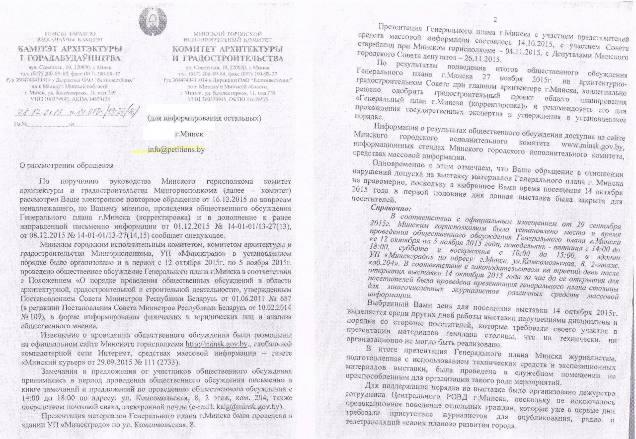 В соответствии с извещением о проведении общественного обсуждения, ознакомиться с экспозицией предлагалось в здании УП "Минскградо" по адресу: г. Минск, ул. Комсомольская д.8, 2 этаж, каб. 204. Поскольку УП "Минскградо" является режимным объектом, доступ в занимаемое им помещение был ограничен все время проведения общественного обсуждения. Для осмотра экспозиции требовалось пройти процедуру регистрации, не прошедших регистрацию не допускали к экспозиции генплана, что ограничивает право на участие в общественном обсуждении. Кроме того, при презентации генерального плана 14 октября 2015 года, граждан, пожелавших ознакомиться с экспозицией, не впустили в здание УП "Минскградо".