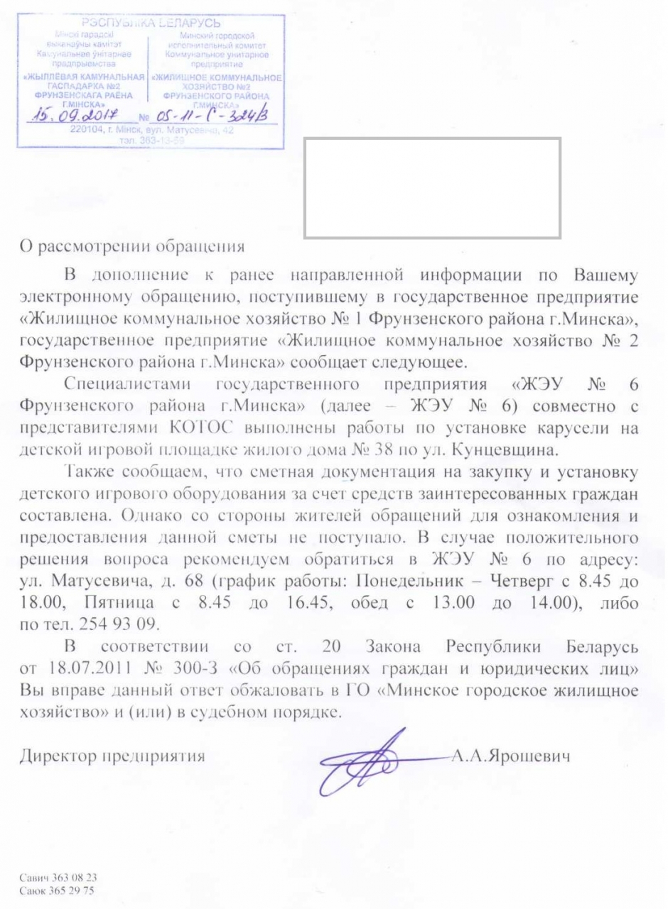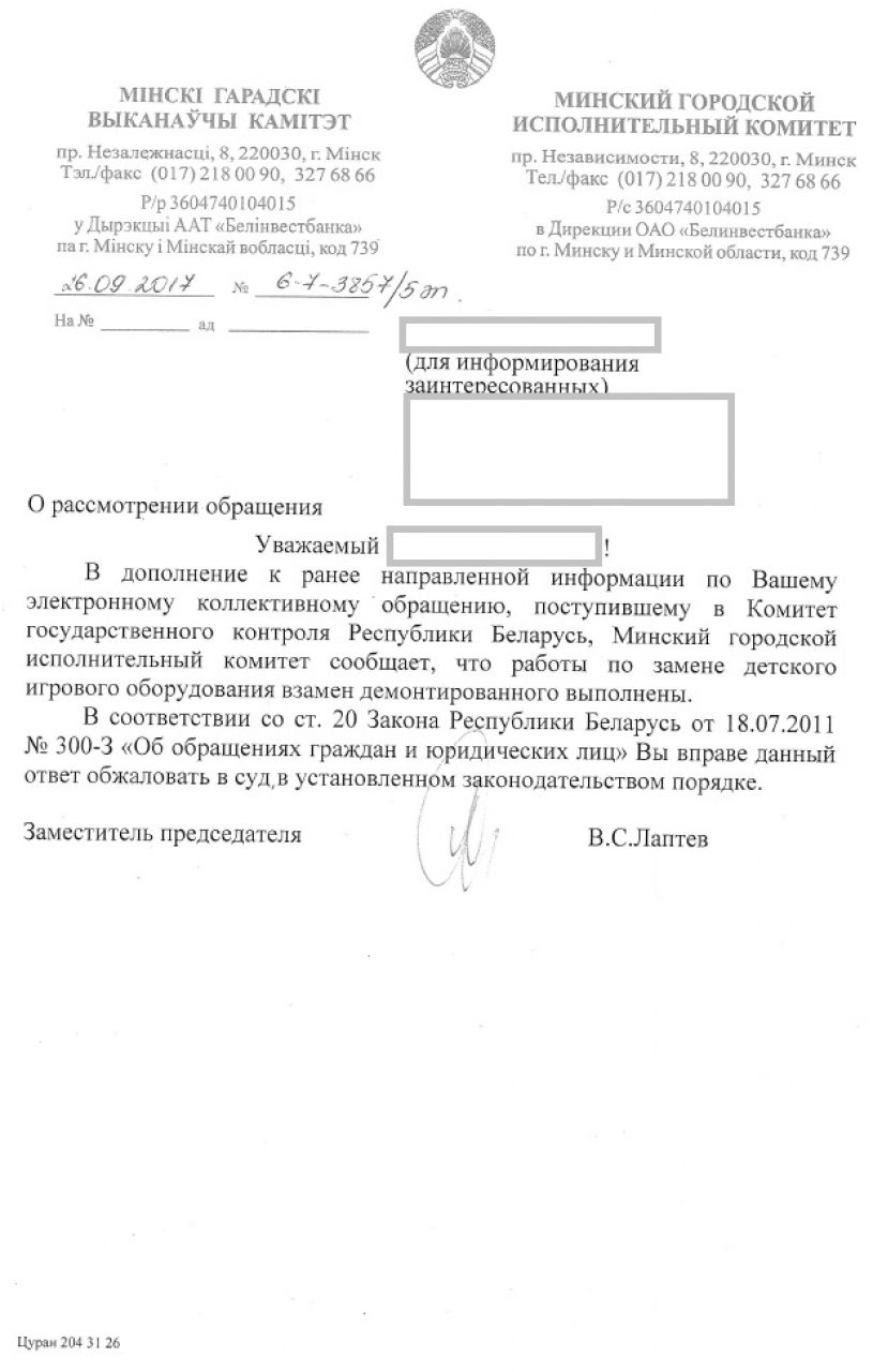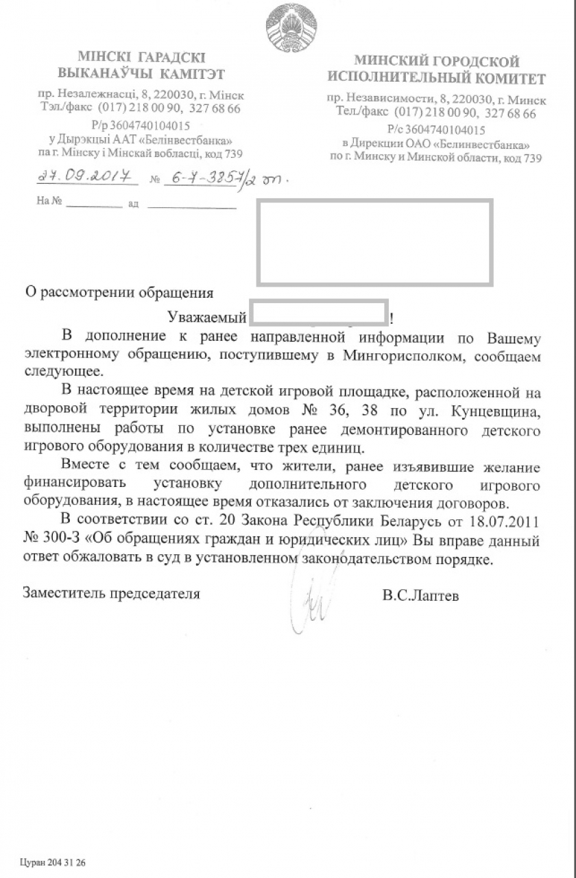 В Администрацию Фрунзенского района г.Минска было направлено коллективное обращение с просьбой восстановления игрового оборудования детской площадки по адресу ул.Кунцевщина 36, 38. В ответе указано, что оборудование качественное, соответствует требованиям НПА.