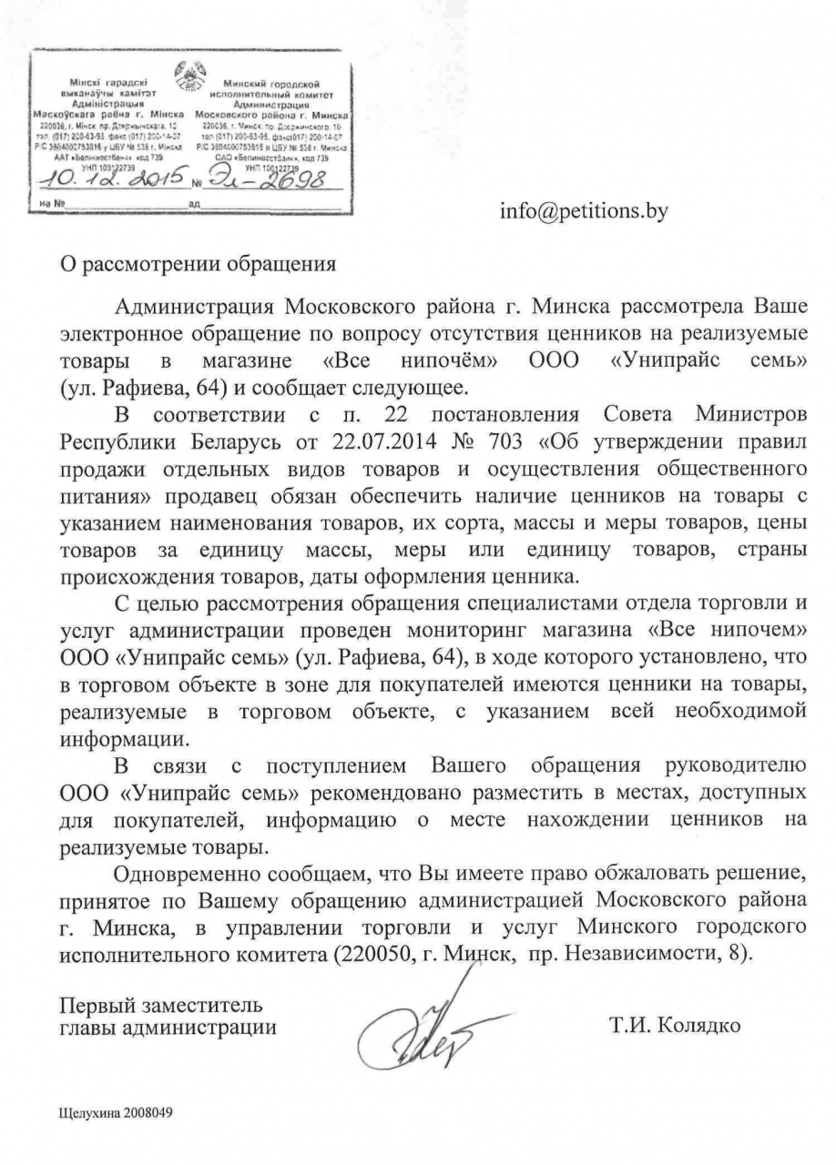В торговом объекте ООО "Унипрайс семь" (УНП 192527380), расположенном в торговом центре на пересечении ул. Рафиева и Есенина (д.68), ценники оформлены с нарушением Правил продажи отдельных видов товаров и осуществления общественного питания, утвержденных постановлением Совета Министров Республики Беларусь от 22 июля 2014 г. № 703, а именно на ценниках отсутствуют наименование товаров, их сорт, масса и мера, страна происхождения товаров, дата оформления ценника.