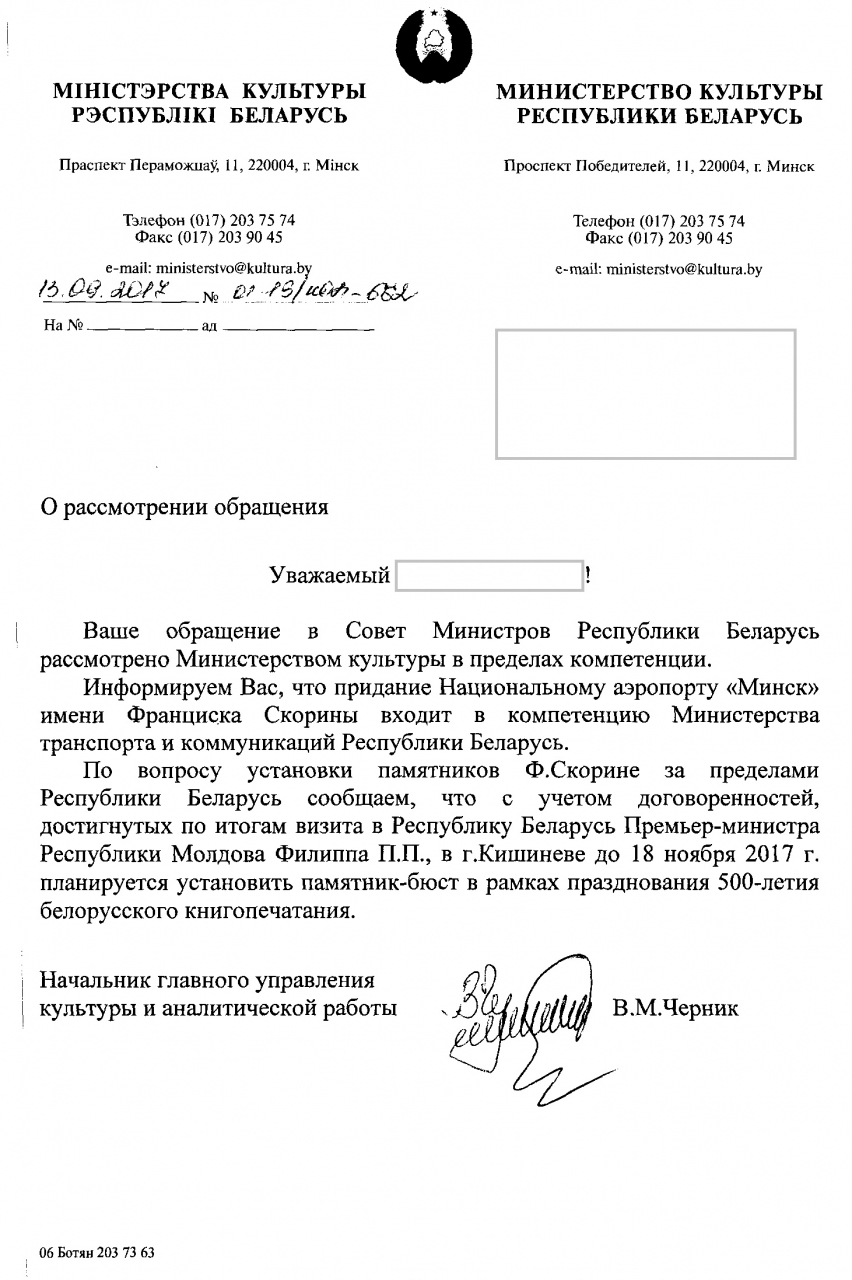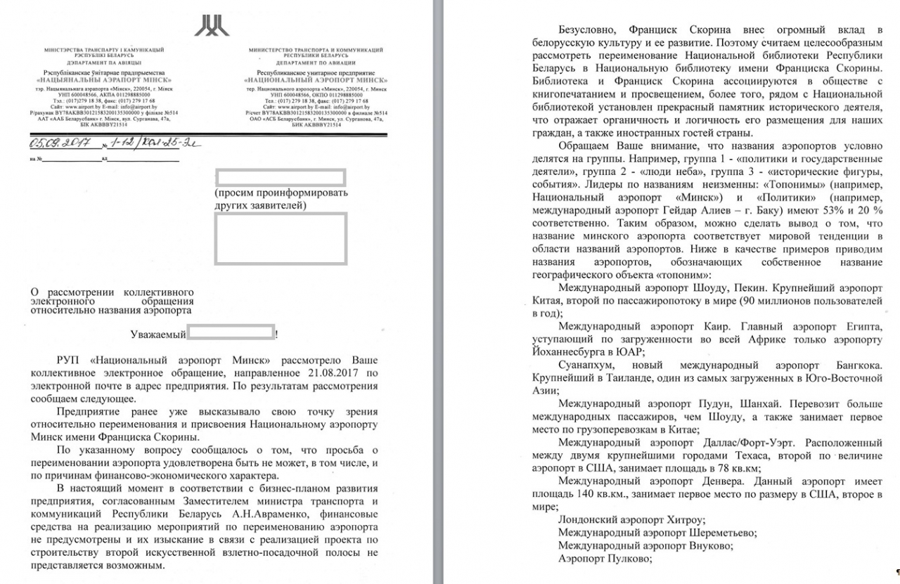 В 2016 году представители белорусской интеллигенции составили обращение в честь 500-летия белорусского книгопечатания: 6 августа 1517 года Франтишек Скорина напечатал «Псалтырь». По этому поводу ученые просили присвоить минскому аэропорту имя нашего Первопечатника. Обращение было направлено Президенту Александру Лукашенко, премьер-министру Андрею Кобякову, а также в Мингорисполком и городской совет.