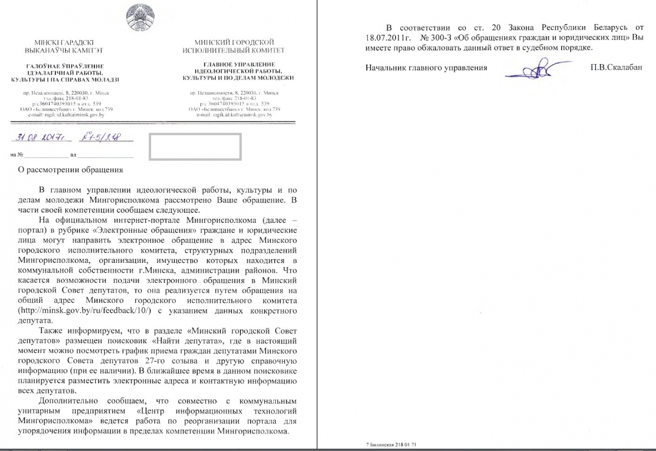 Вместе с тем, Мингорисполкомом отлично реализована возможность направления электронных обращений не только в сам исполком, но и в различные подведомственные организации (режим доступа http://minsk.gov.by/ru/feedback/, дата доступа 07.08.2017). Вот только городской Совет депутатов в этом списке почему-то отсутствует. Возможно, соответствующая информация на сайте Мингорисполкома и размещена, но то, что найти ее не представляется возможным, свидетельствует о ненадлежащем состоянии работы с обращениями граждан и юридических лиц.