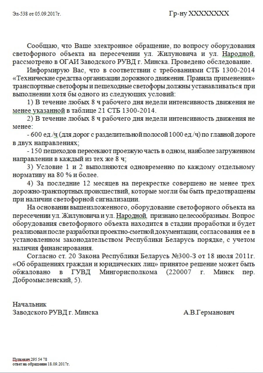 Оборудование светофорного объекта на пересечении ул. Жилуновича и ул. Народной, признано целесообразным.